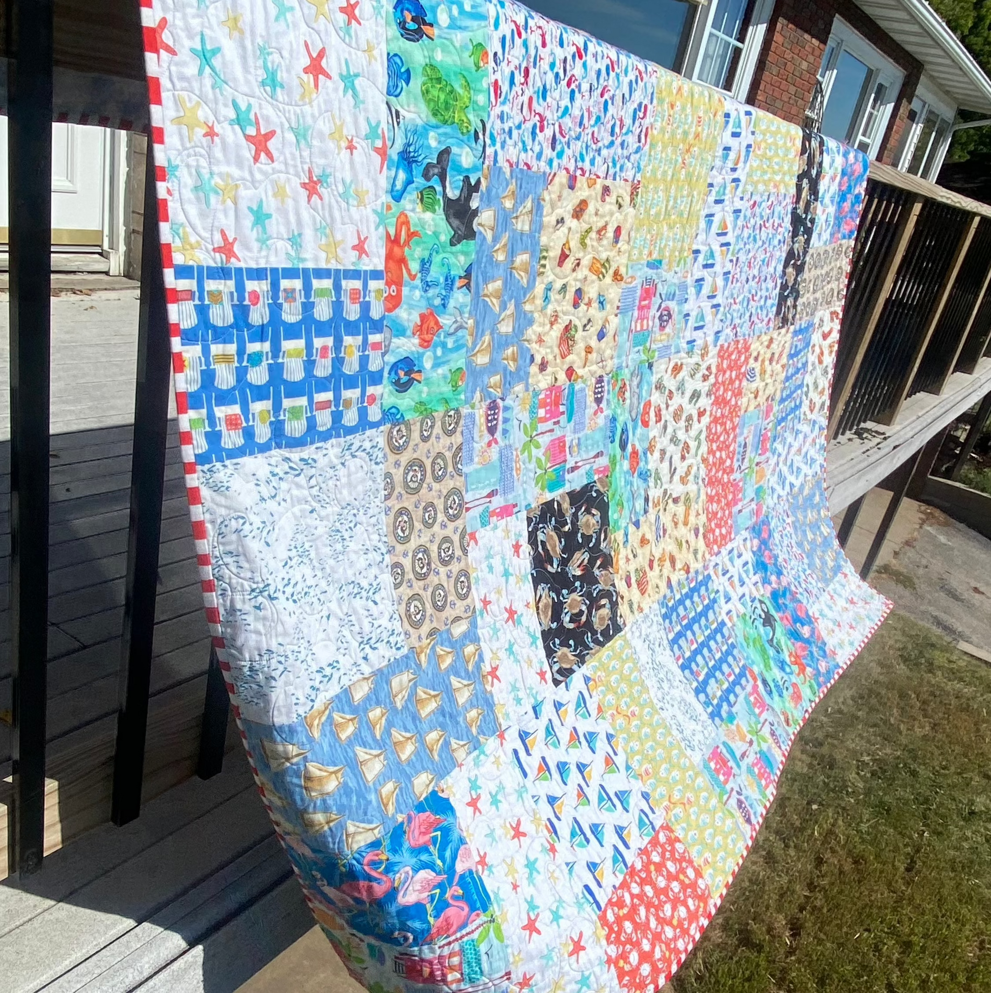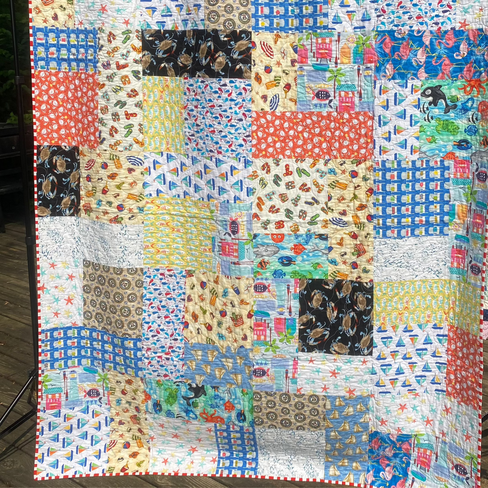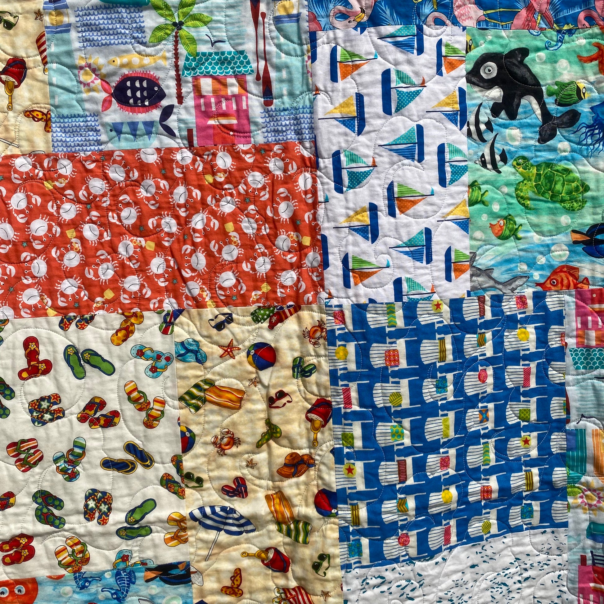 Take a nautical trip with the Day at the Beach quilt. This colorful quilt features large blocks with starfish, sail boats, beach critters, beach chairs, seaweed and other seaside friends. Finished with red and white striped binding, and a hand sewn invisible stitch. It would make a perfect addition to a day by the water.