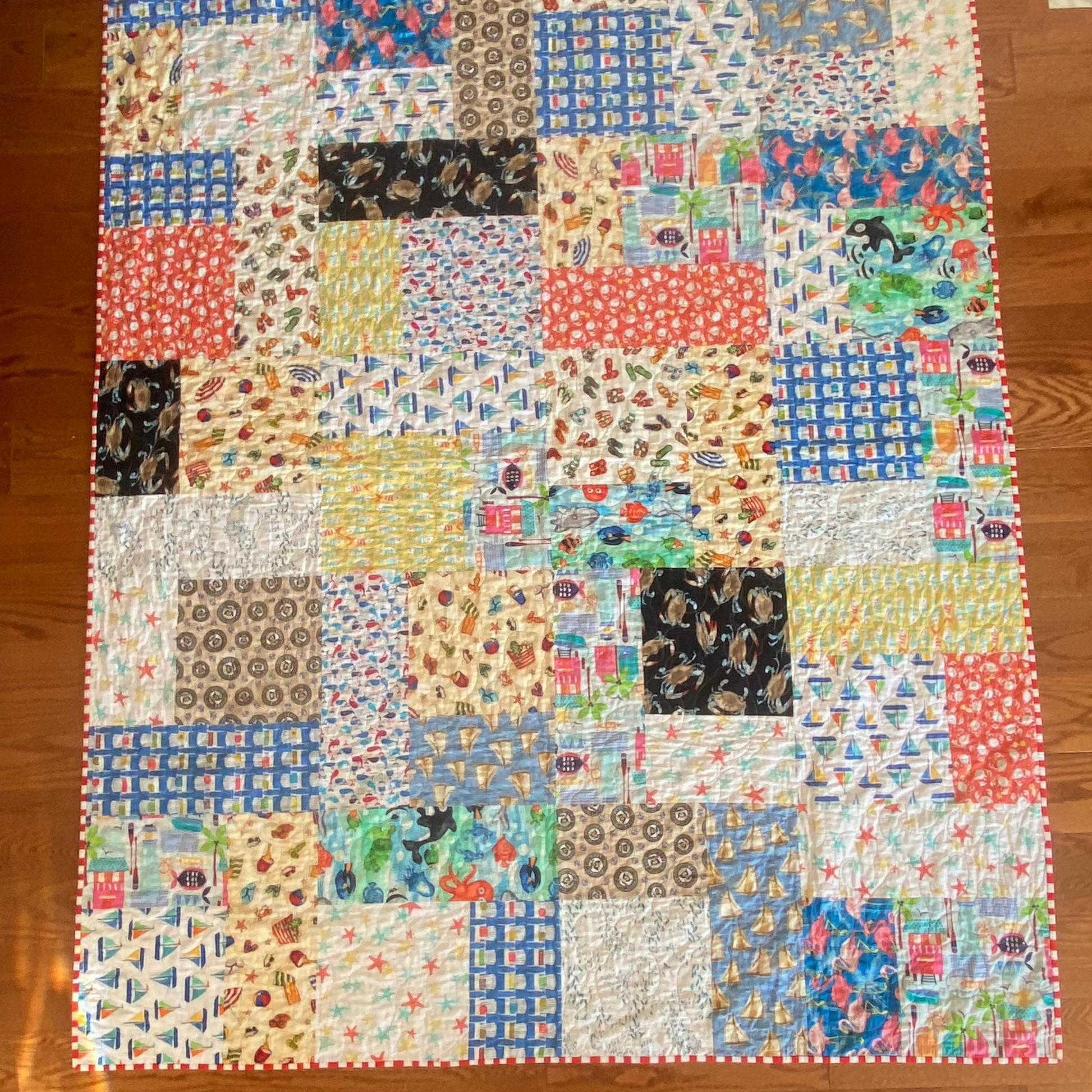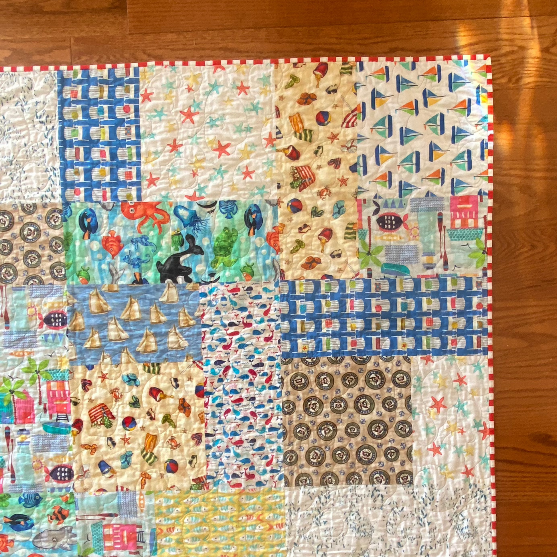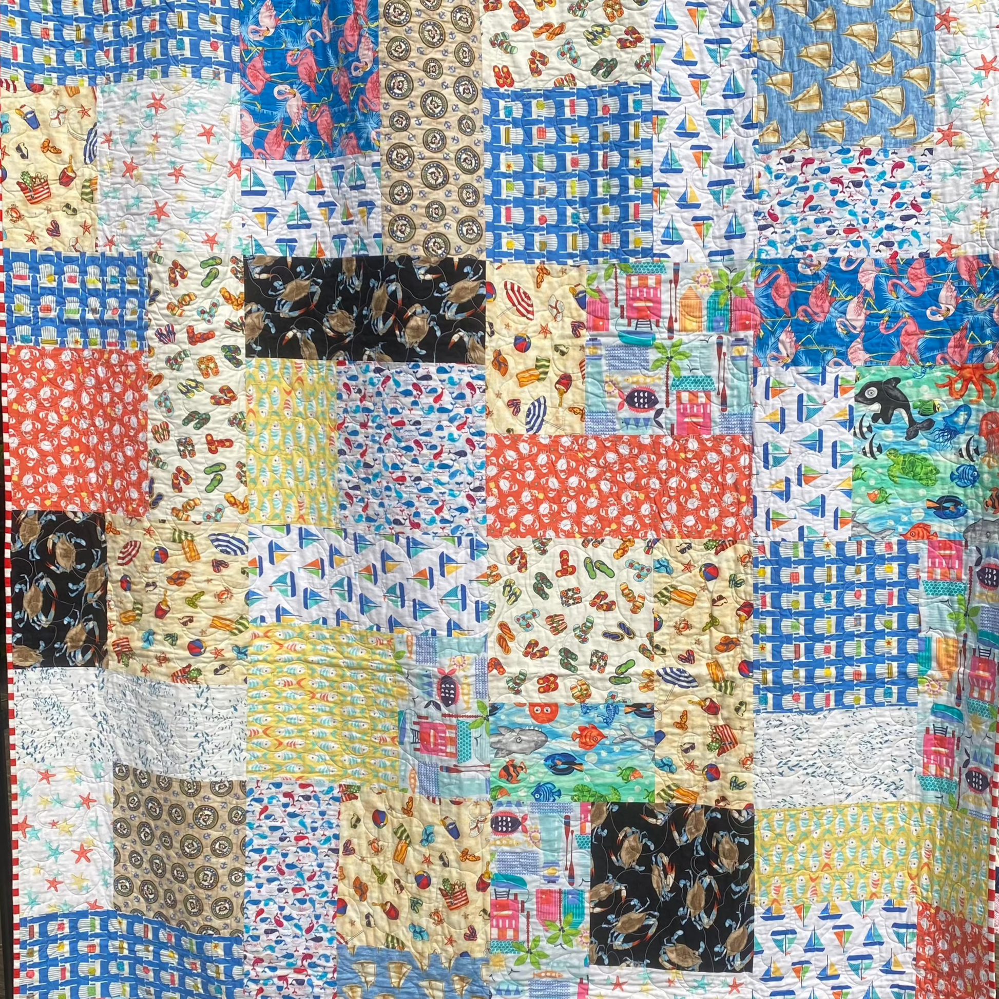 Take a nautical trip with the Day at the Beach quilt. This colorful quilt features large blocks with starfish, sail boats, beach critters, beach chairs, seaweed and other seaside friends. Finished with red and white striped binding, and a hand sewn invisible stitch. It would make a perfect addition to a day by the water.