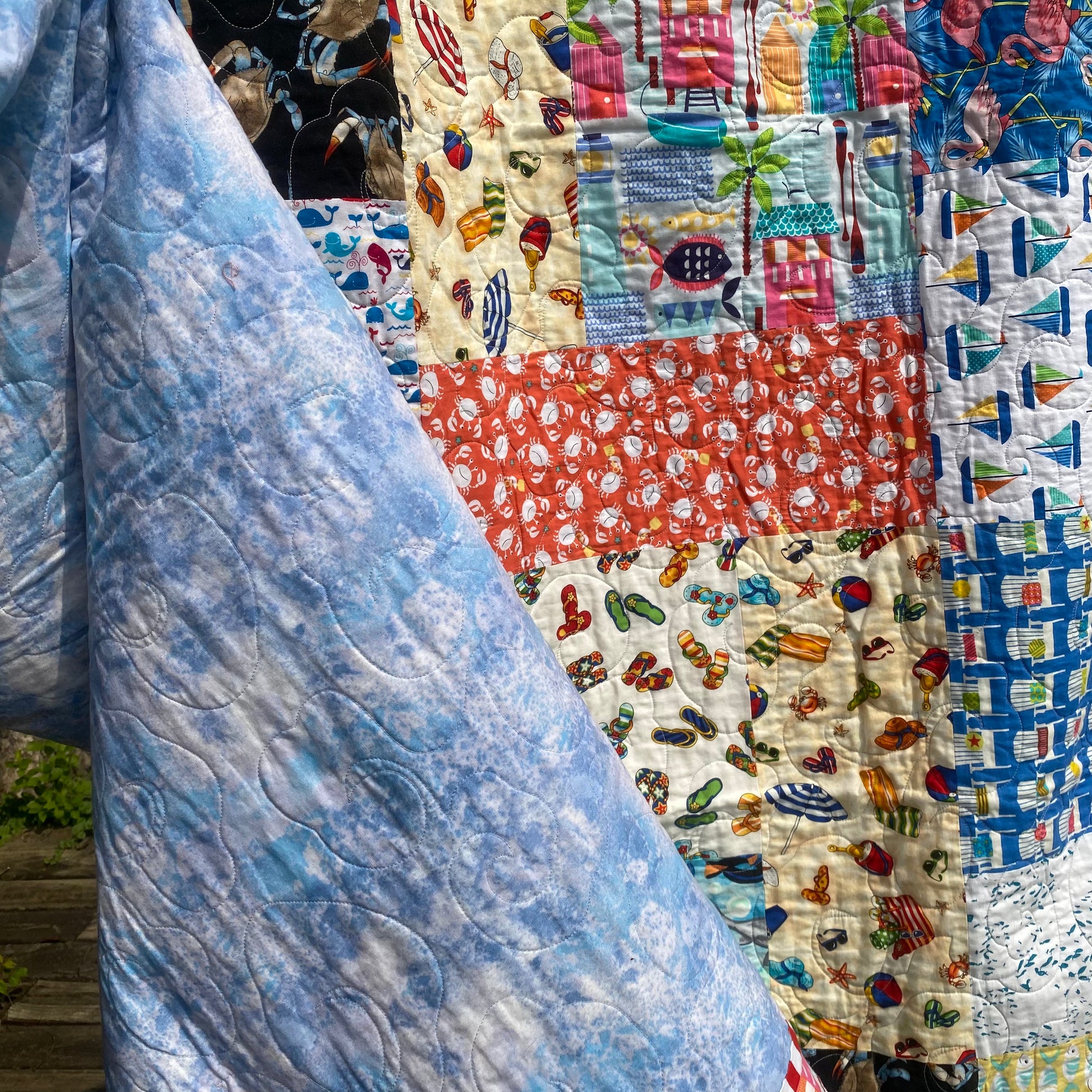 A Day at the Beach is backed in light blue reflections fabric. It was stitched with waves on a hand guided long arm. This quilt is filled with 80/20 batting. It's light but will keep you cozy during the cooler weather.