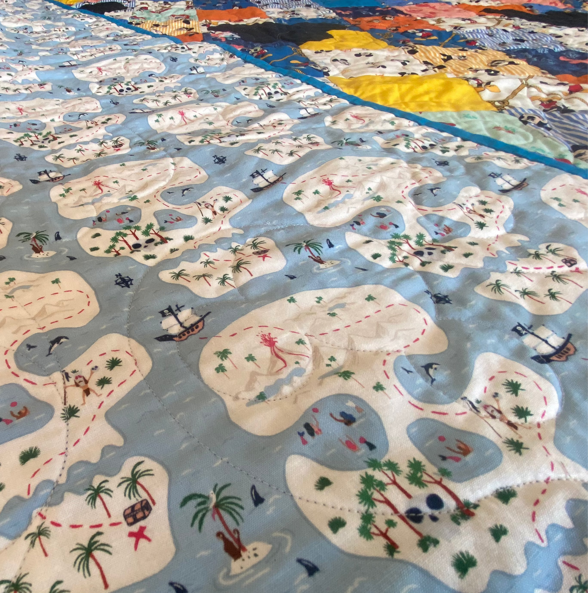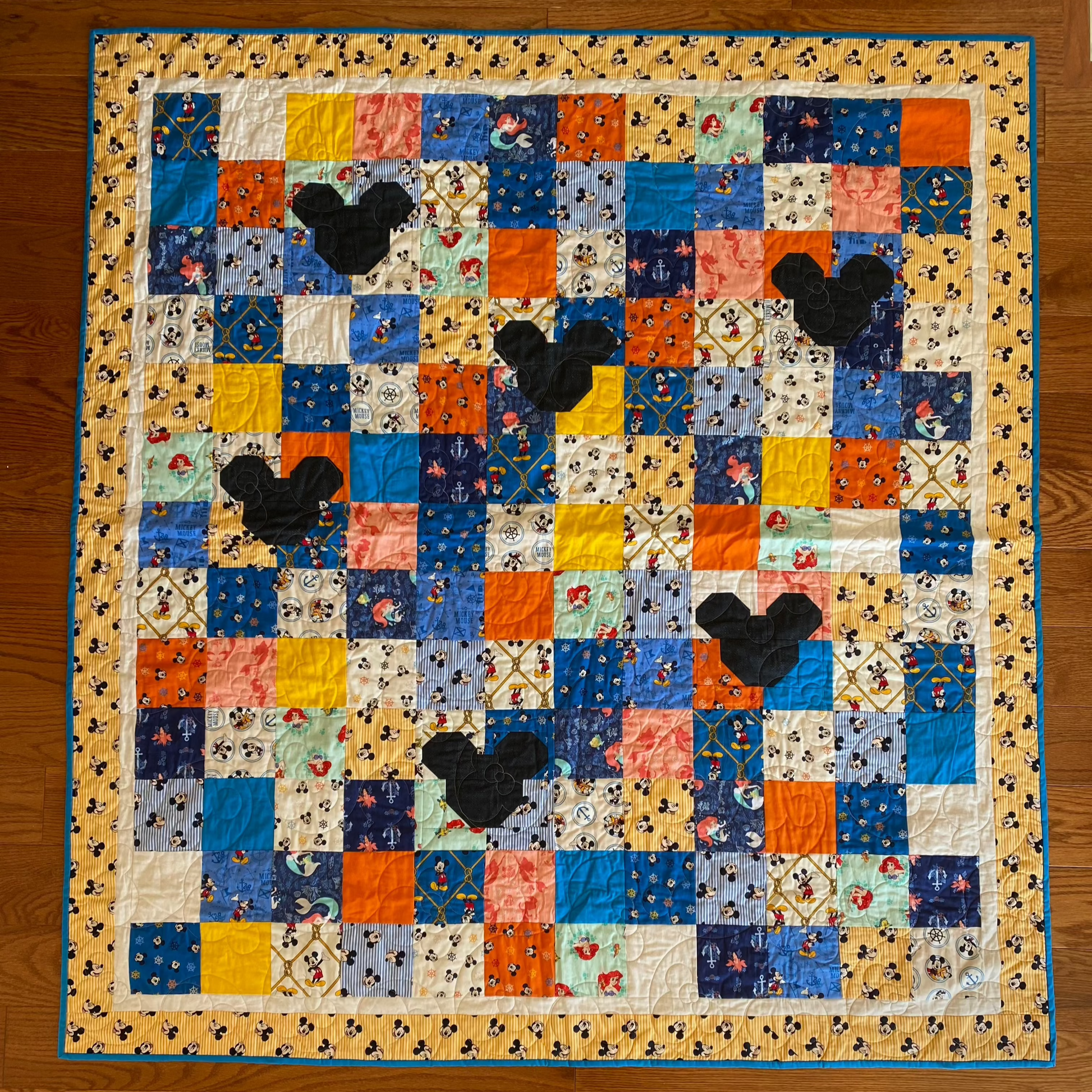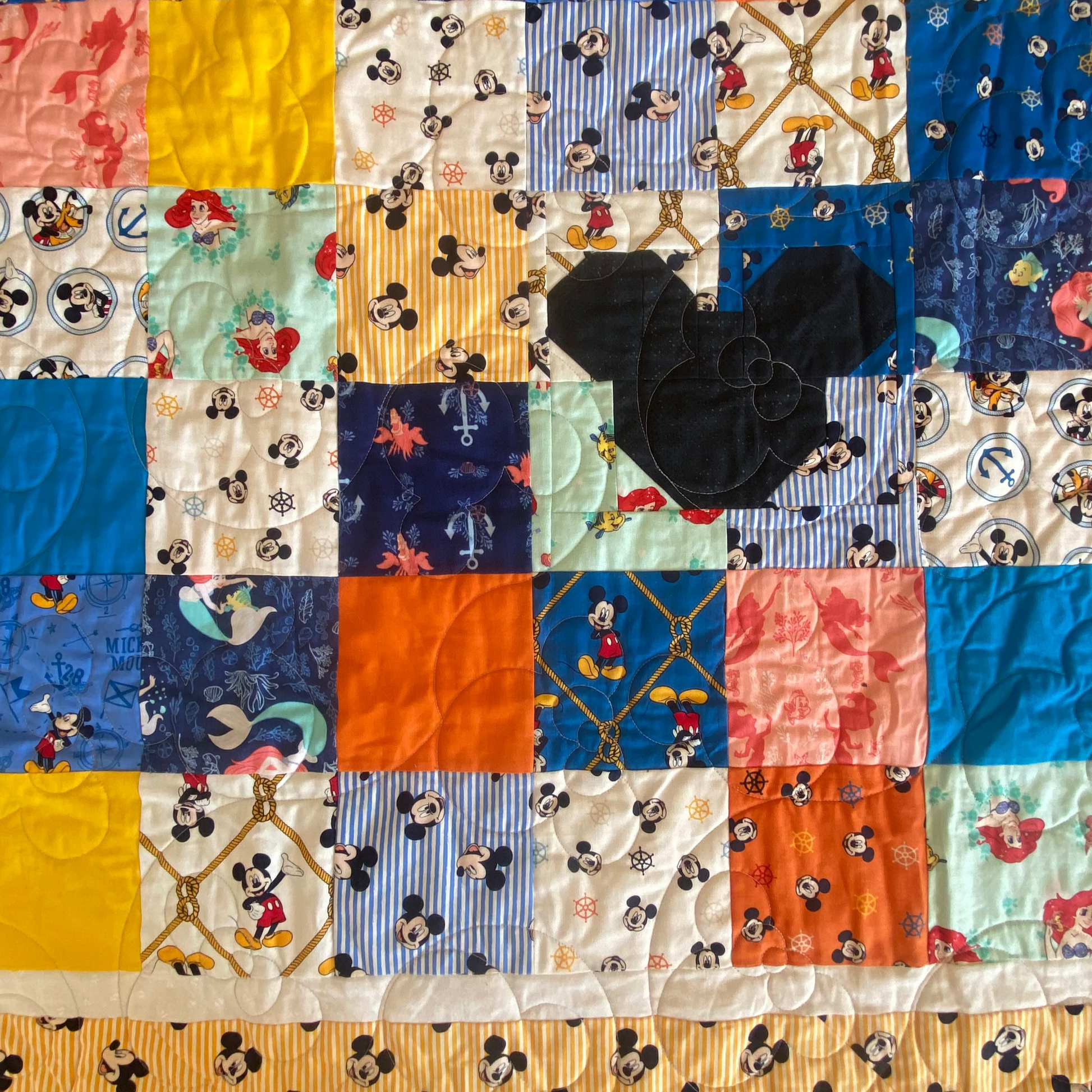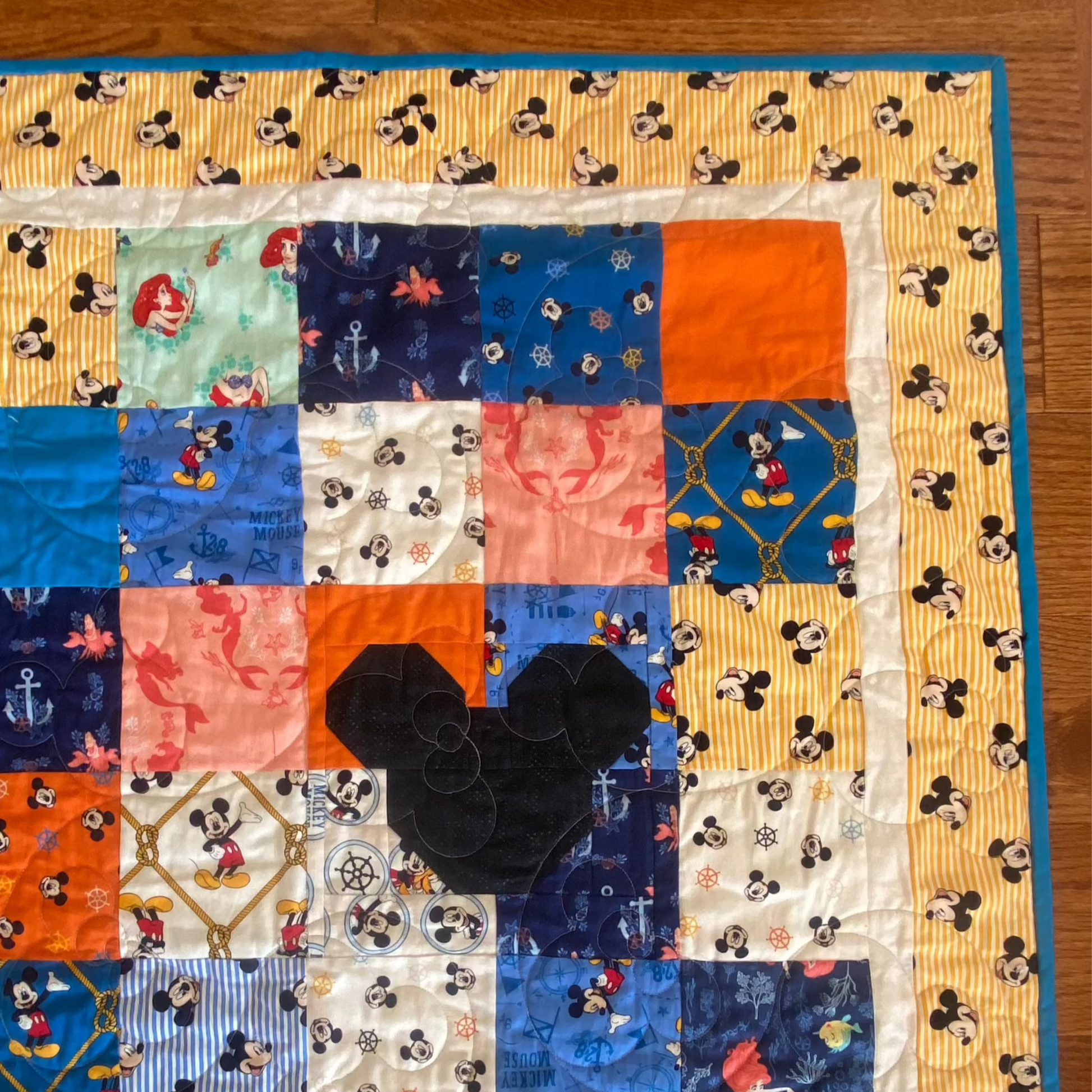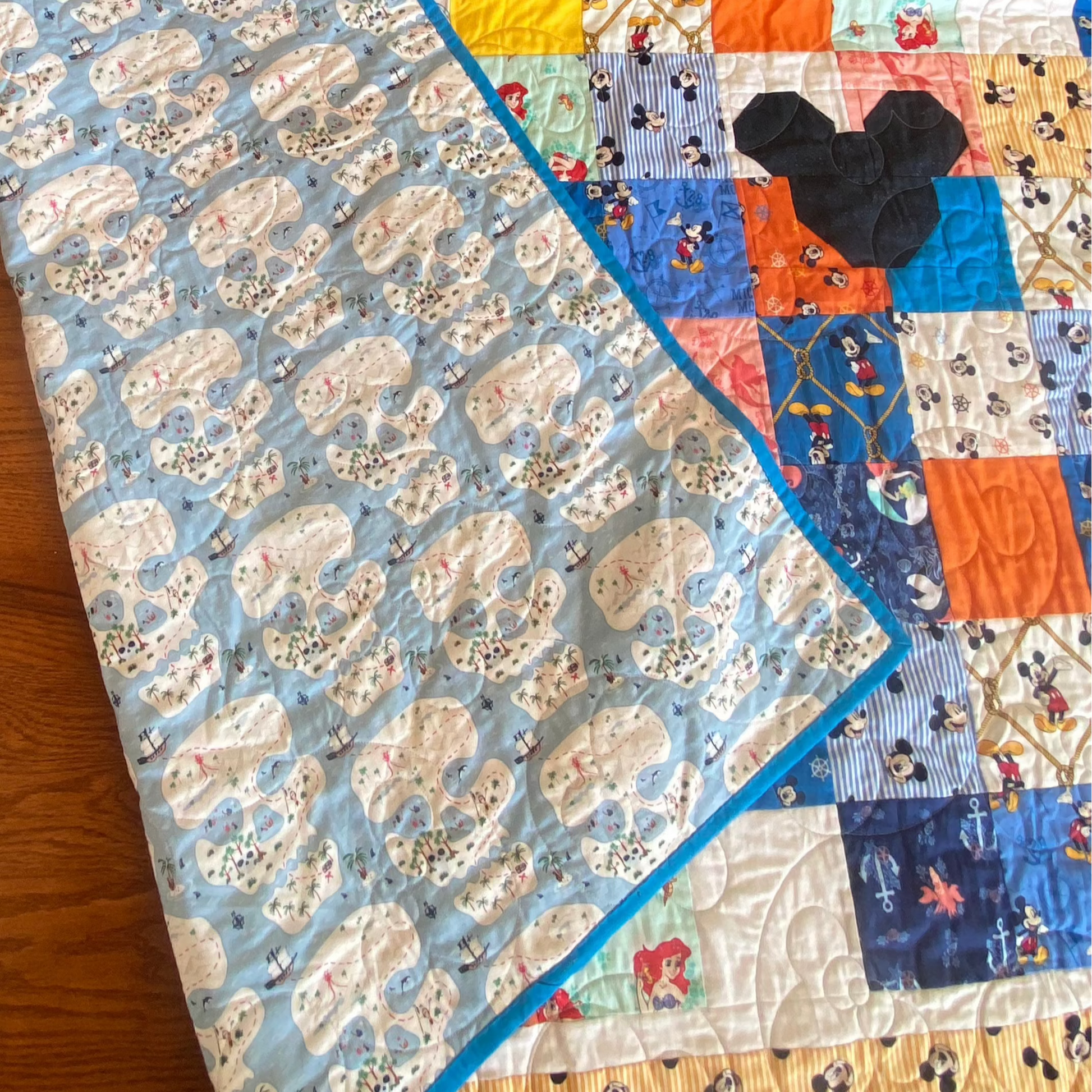 A Magical Day shines bright with shades of orange, and yellow, and blue, highlighting the classic black Mickey ear blocks. Made with quality licensed Disney cotton fabrics, it features Goofy, Mickey, Sebastian, Flounder, Ariel and other favorites! This adventurous quilt is backed with a pirate skull island treasure map in blue. There's an overall nautical theme throughout the front and back, with anchors, sailors knots and more. It's tied together with a striped white and yellow Mickey border.