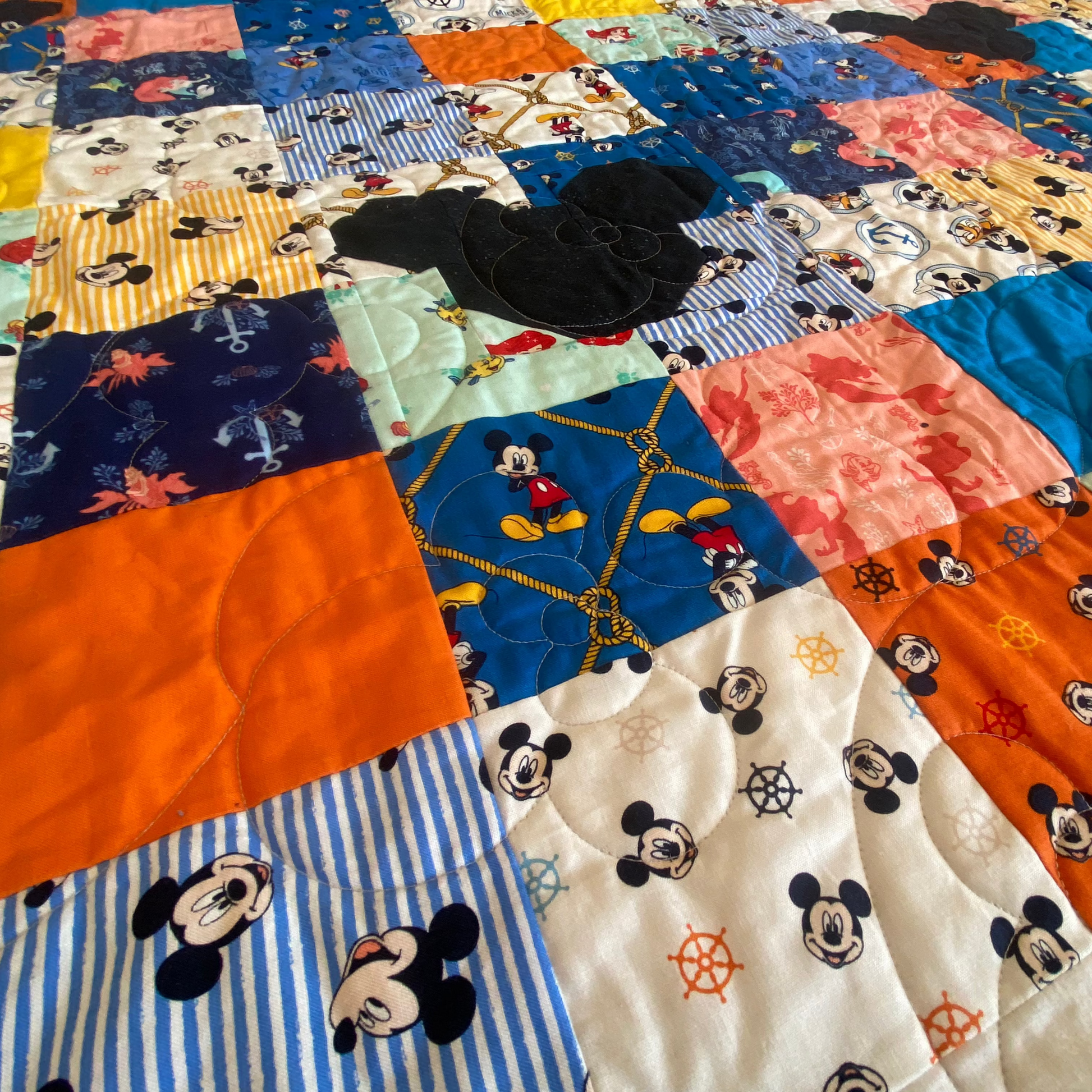 This quilt was manually custom stitched with a Mickey ears pattern on a long arm. Filled with fluffy dream cotton 80/20 batting, it's warm but lightweight. Hand bound coordinating blue edge to finish.