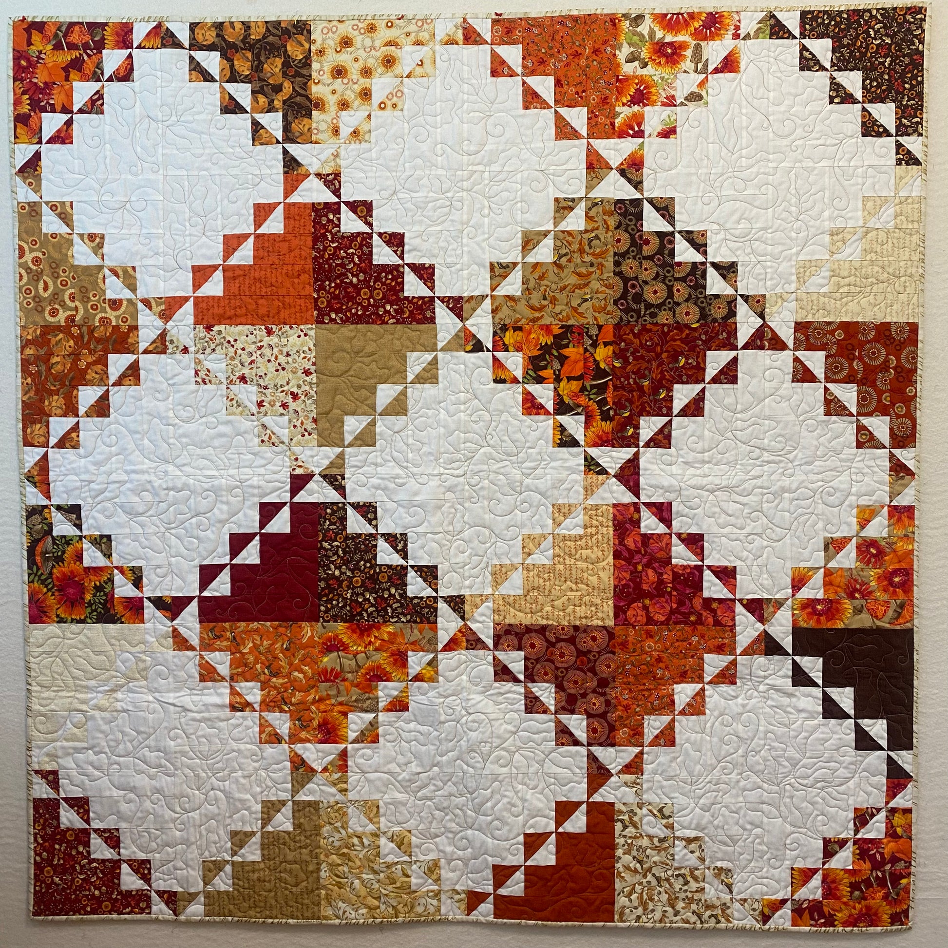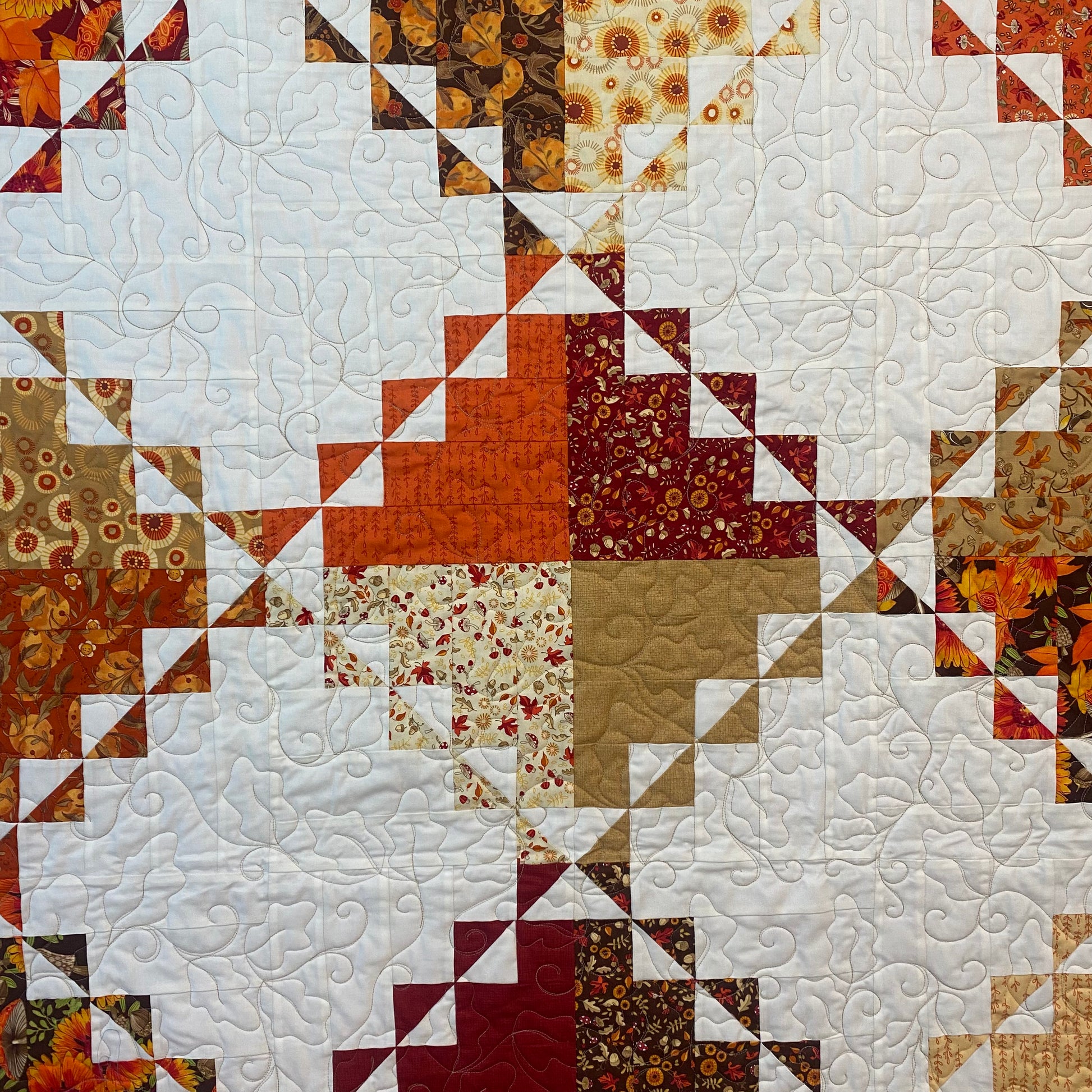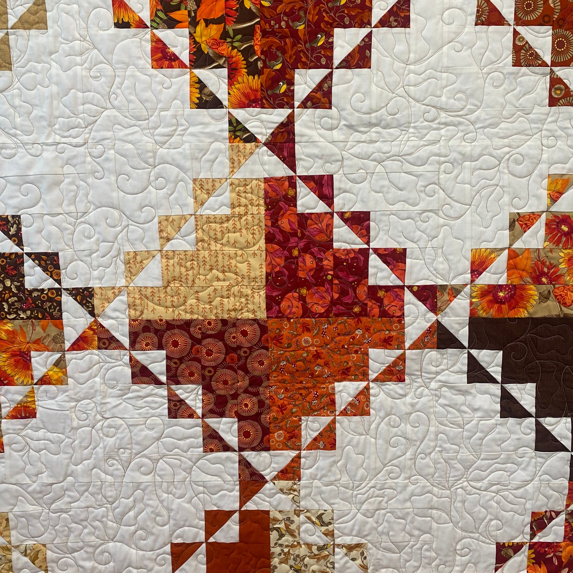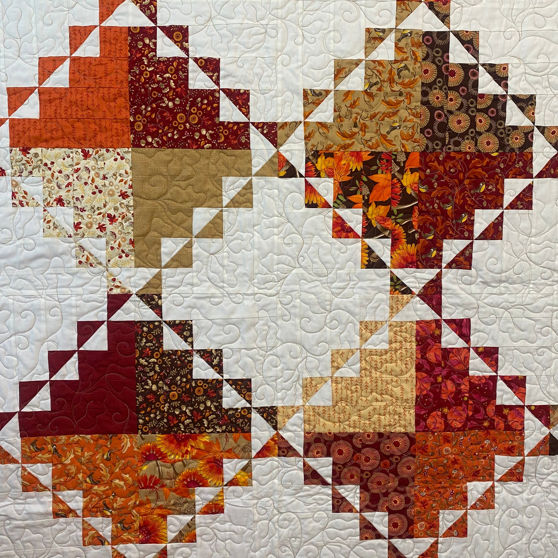 A perfect companion on any leaf-peeping road trip or cozy bonfire night at home. Autumn Illusion uses a singular block made from a variety of oranges, golds, burgundies, browns and other tones reminiscent of changing leaves. Fall colors swirl around this intertwining design. These blocks have been set in an alternating pattern to create a checkered New England meets Southwest vibe.