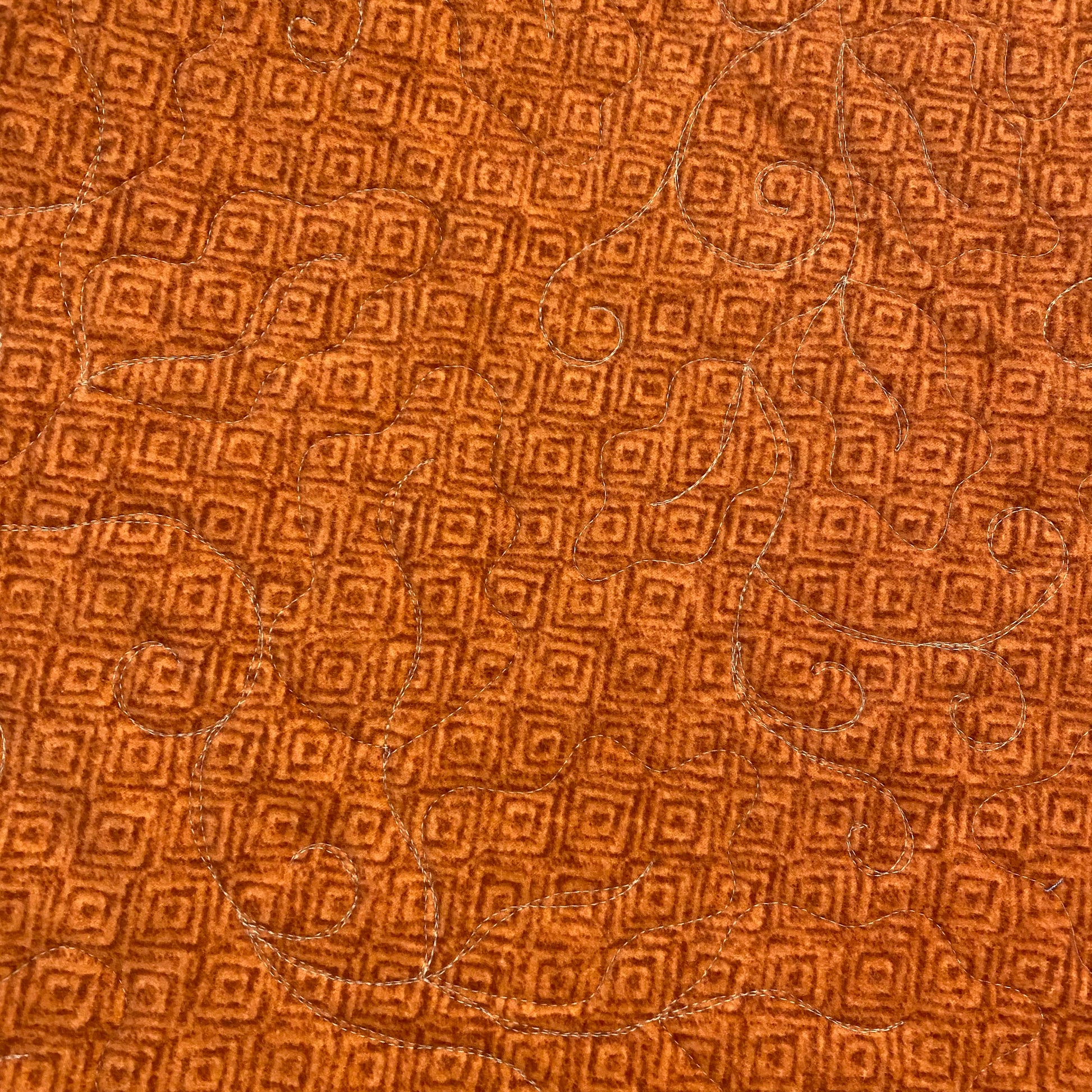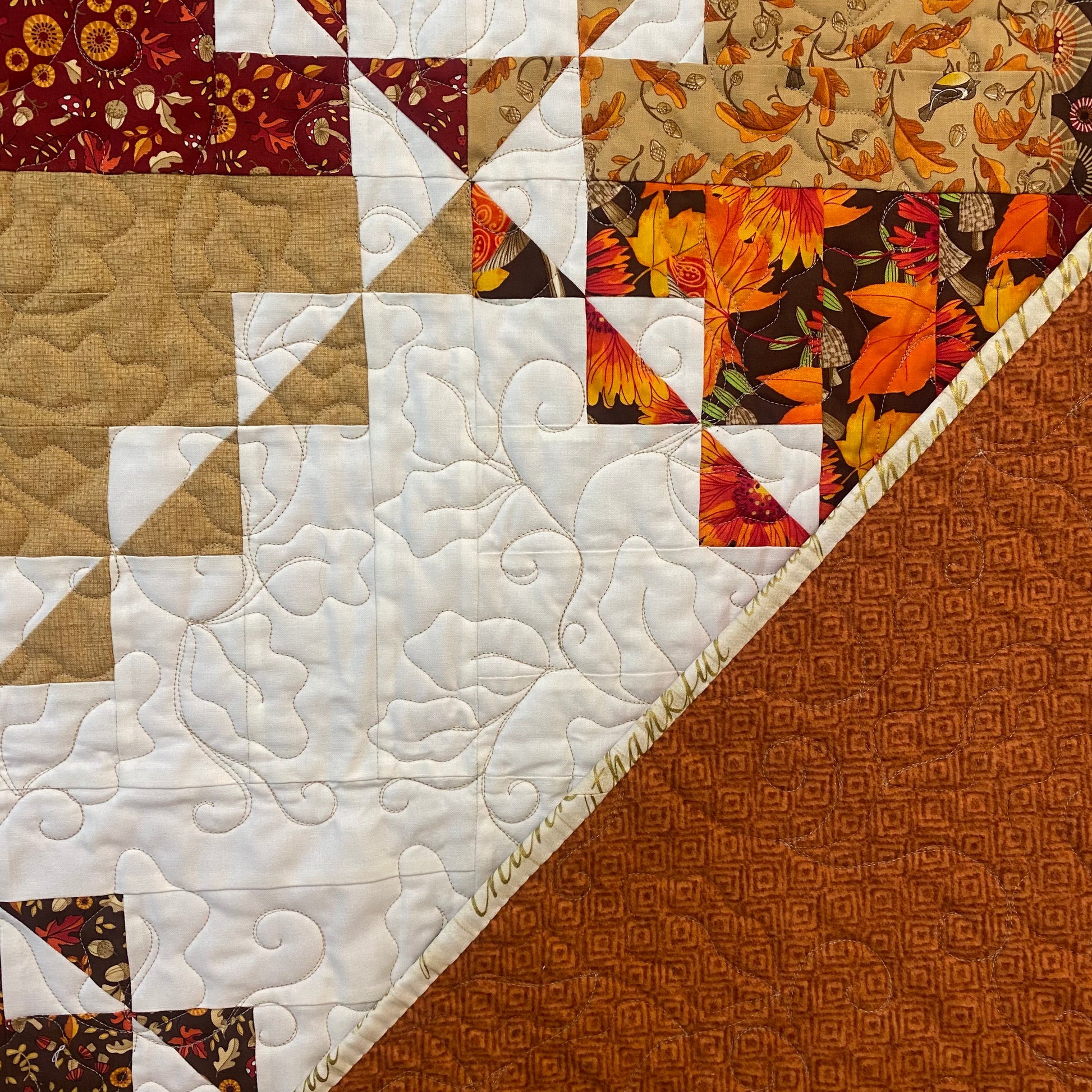 Autumn Illusion features leaves, grains, sunflowers, mushrooms, acorns, and birds, set on a creamy background. This quilt has been backed in an orange geometric flannel. It was quilted on a hand guided longarm in golden tan thread, in a whirling leaf pile edge to edge pattern.