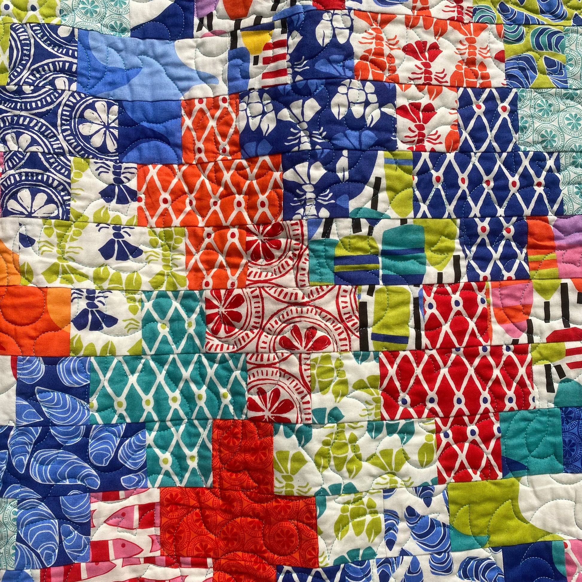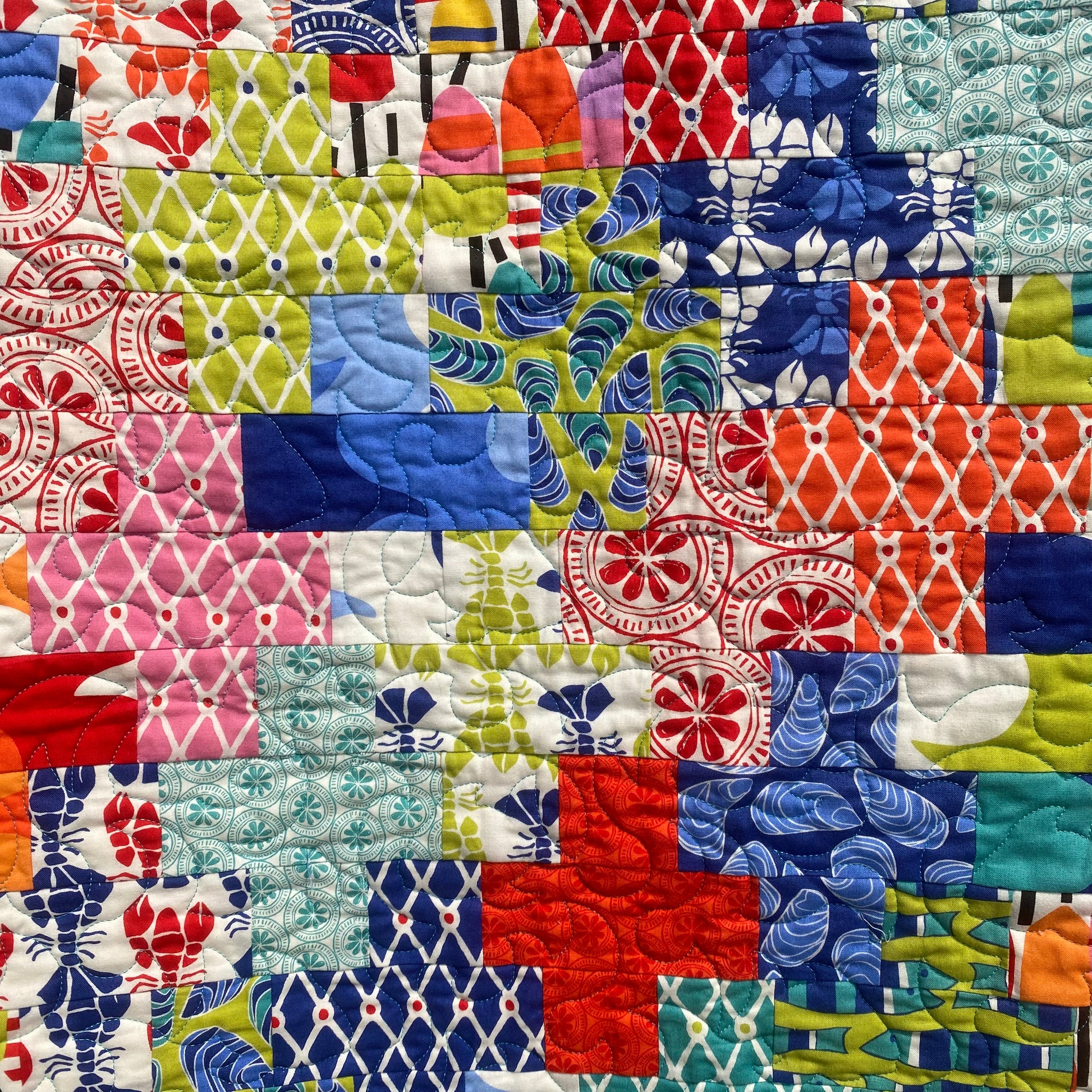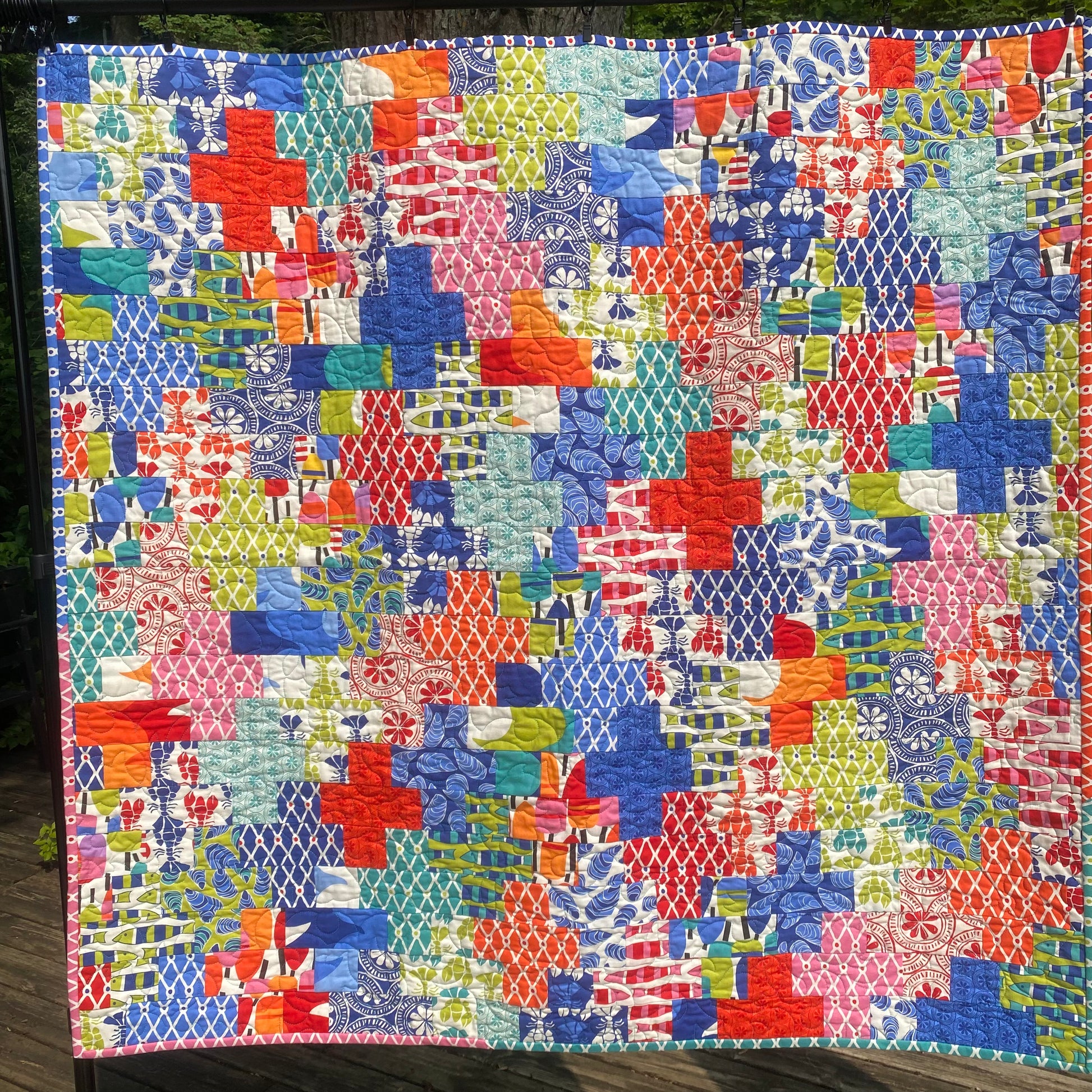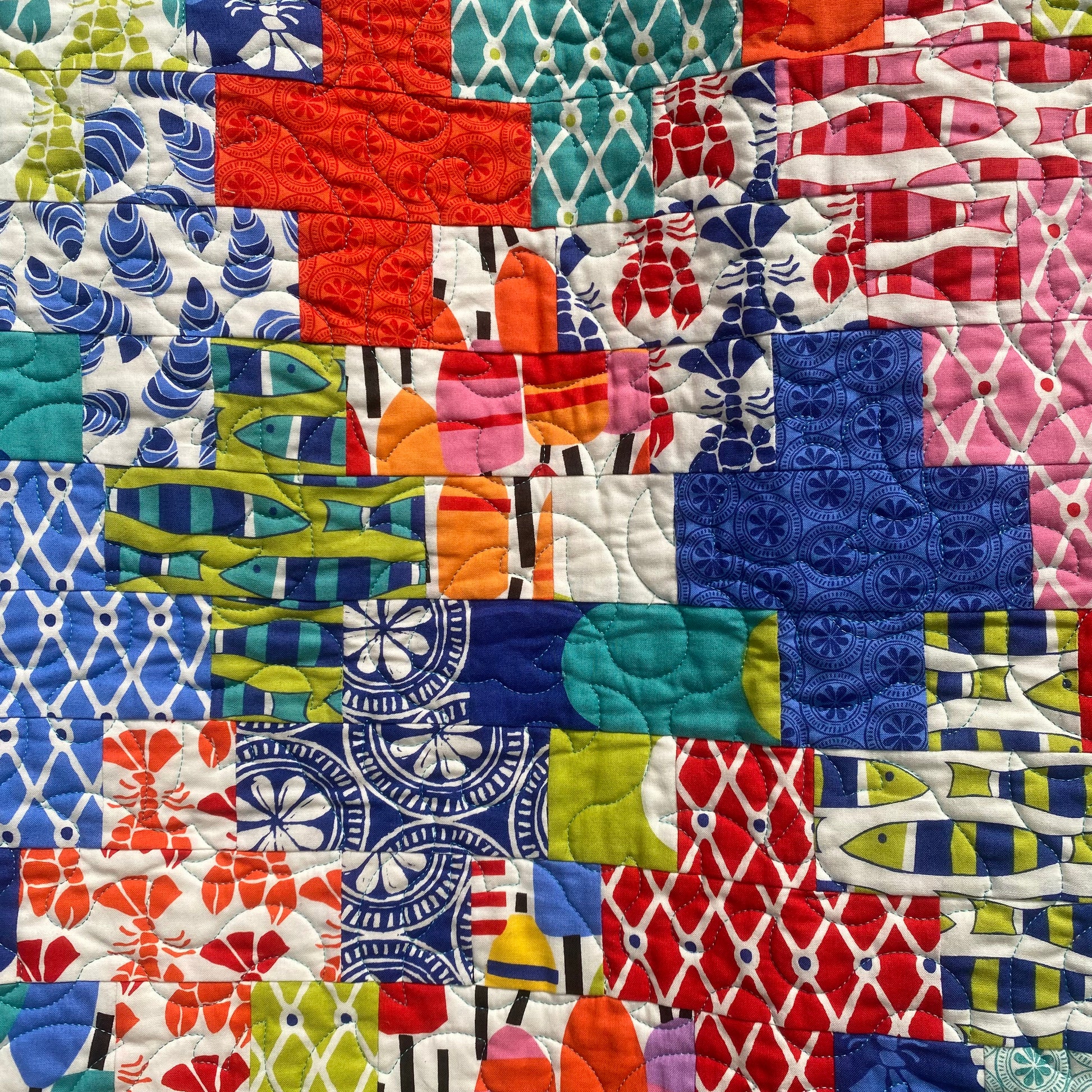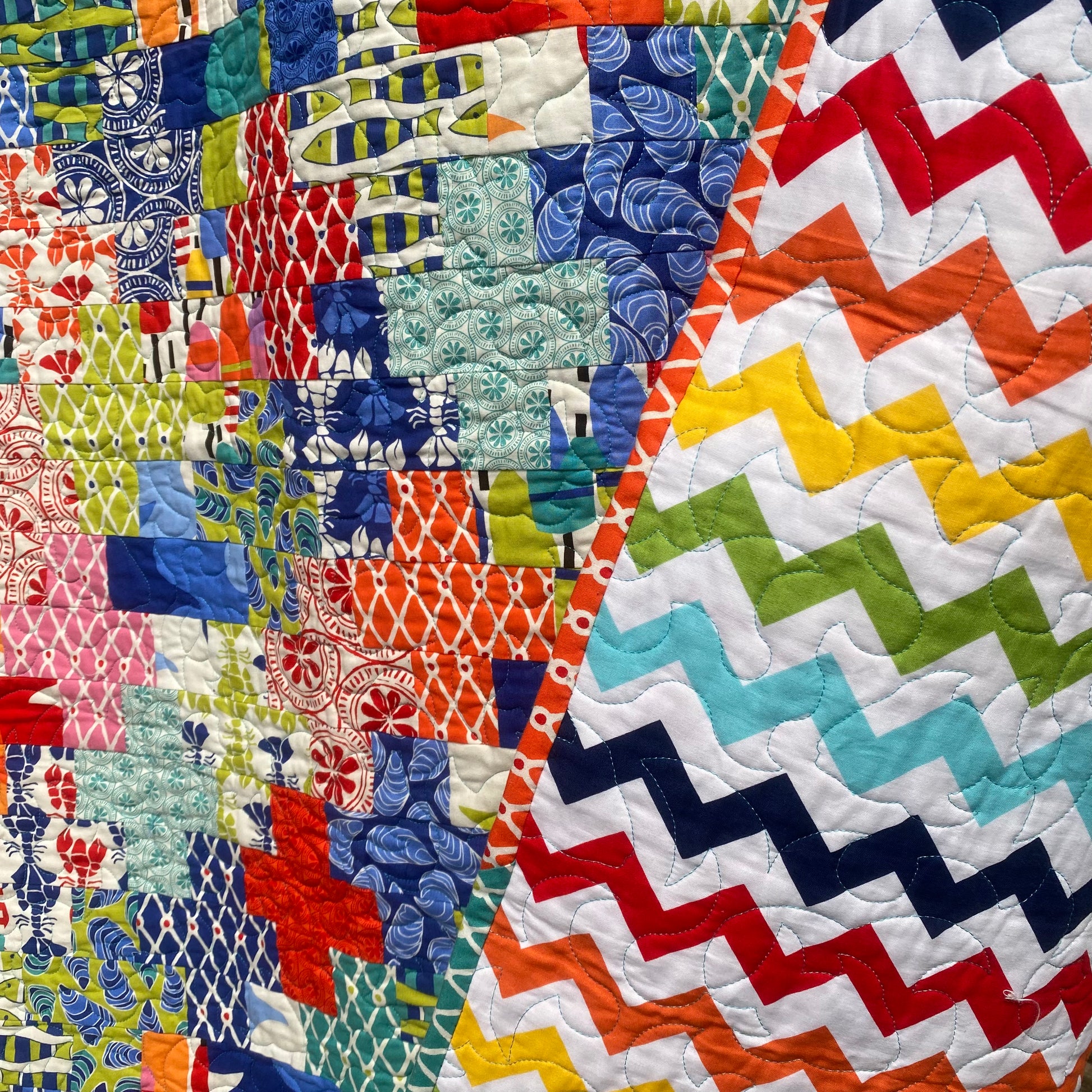 This quilt is backed in an alternating rainbow chevron pattern, set on a white background. Waterfront Crossing was hand guided on a long arm and stitched with a waves and fish pattern. This quilt was filled with 80/20 batting. It is cozy but lightweight.