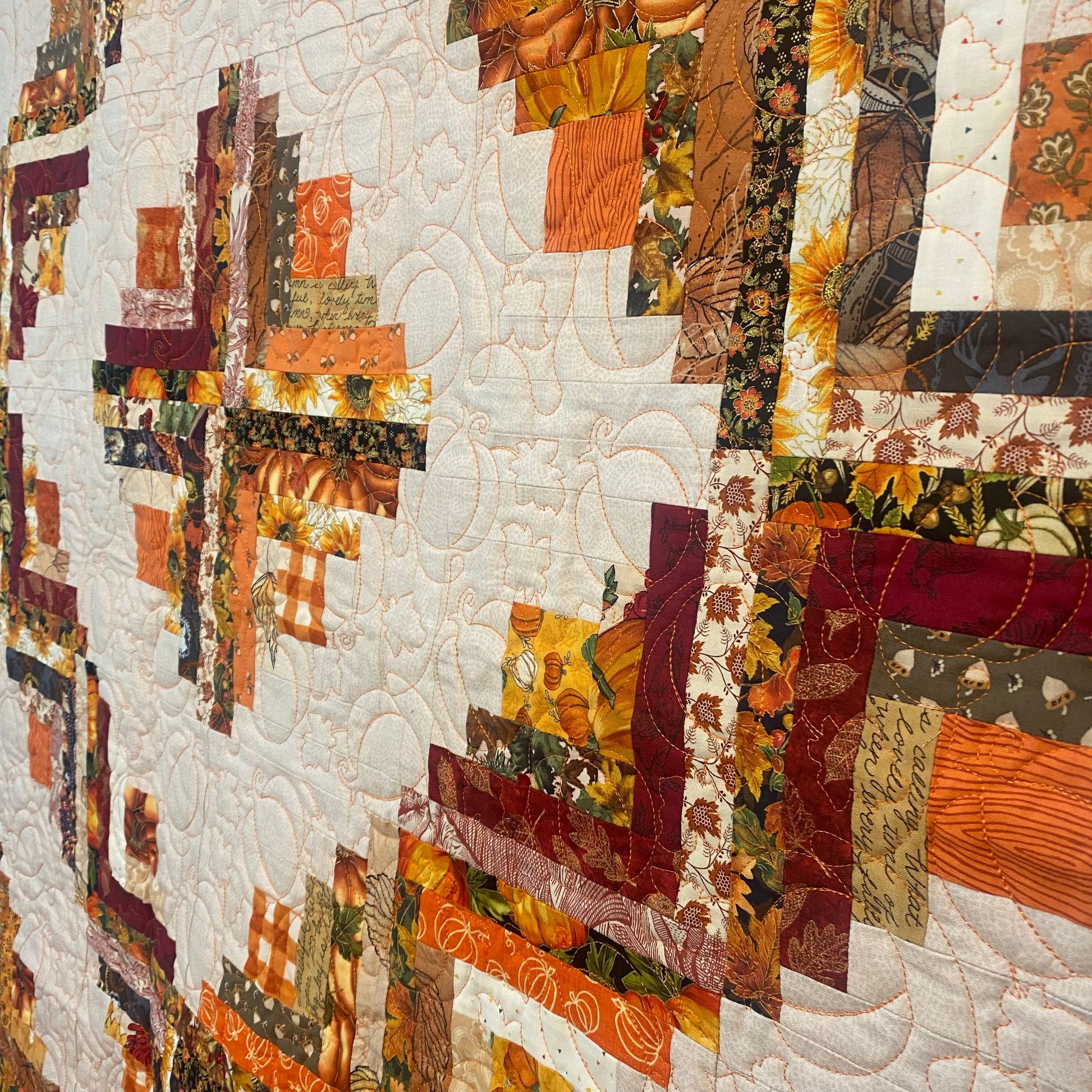 The Falling Logs Cabin quilt was quilted on a had guided long arm. Edge to edge leaves and pumpkins stitched with orange thread. Filled with 80/20 batting, this is the perfect size and loft for cozy nights in and fireside sessions.
