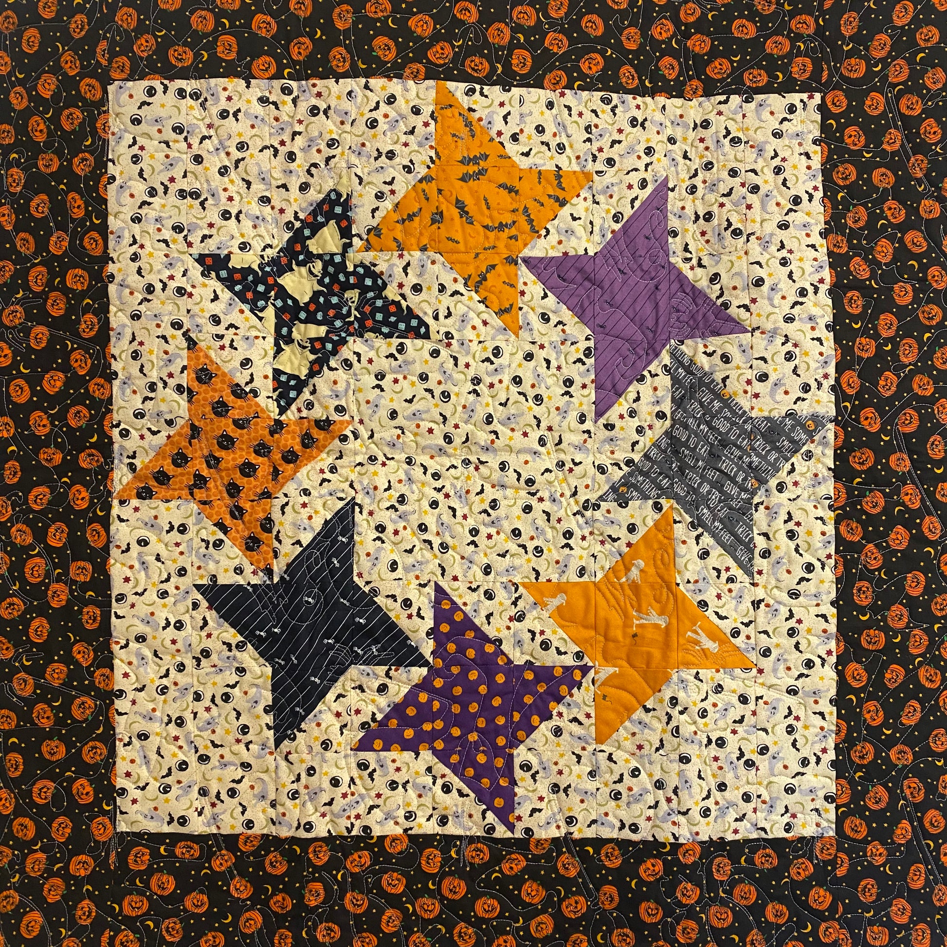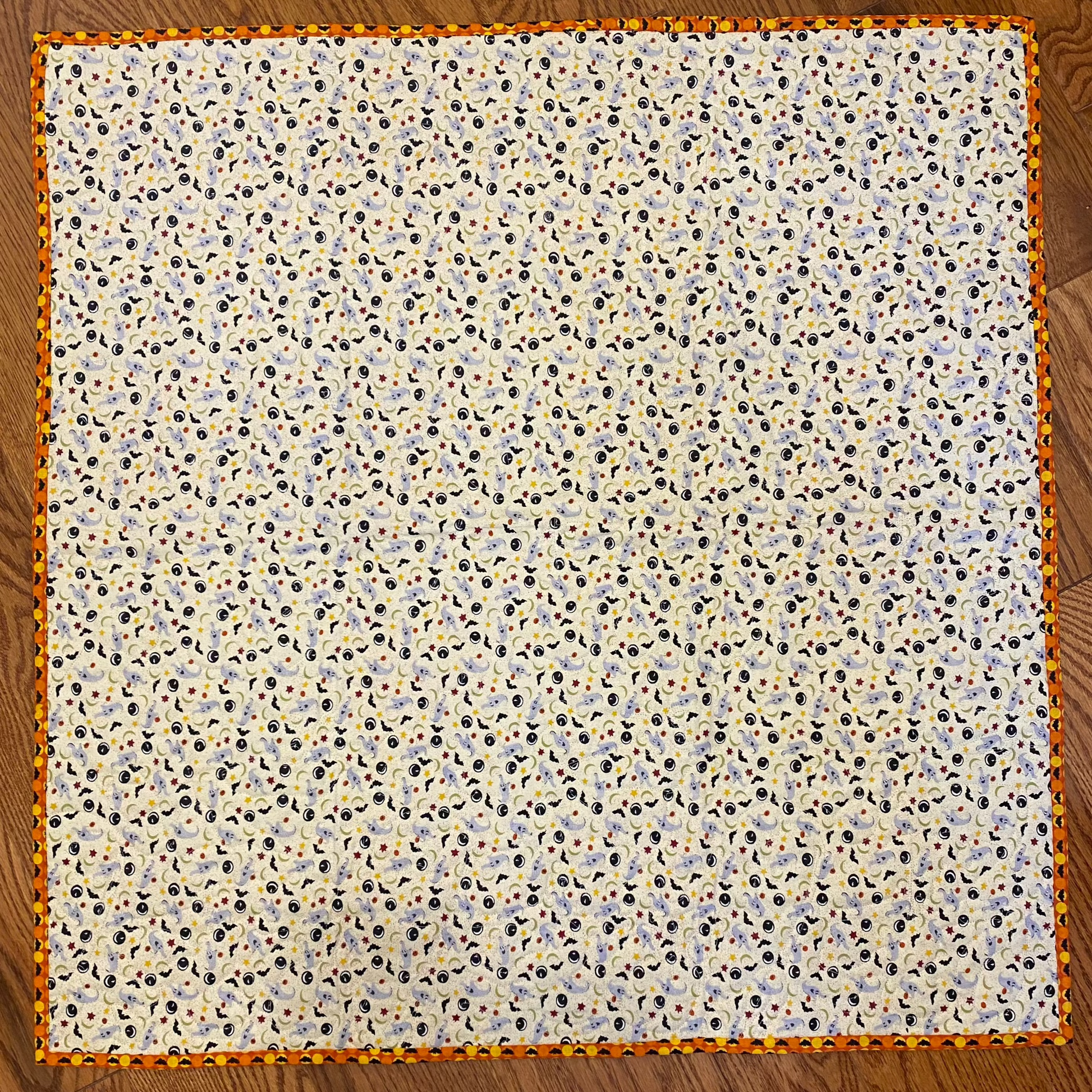 Set on a cream background filled with ghosts and eyeballs, it's bordered in orange on black pumpkins. Halloween Friends Wreath was quilted in witch's hats and brooms, spiders, and pumpkins, in grey thread. Hand bound finish in orange bats.