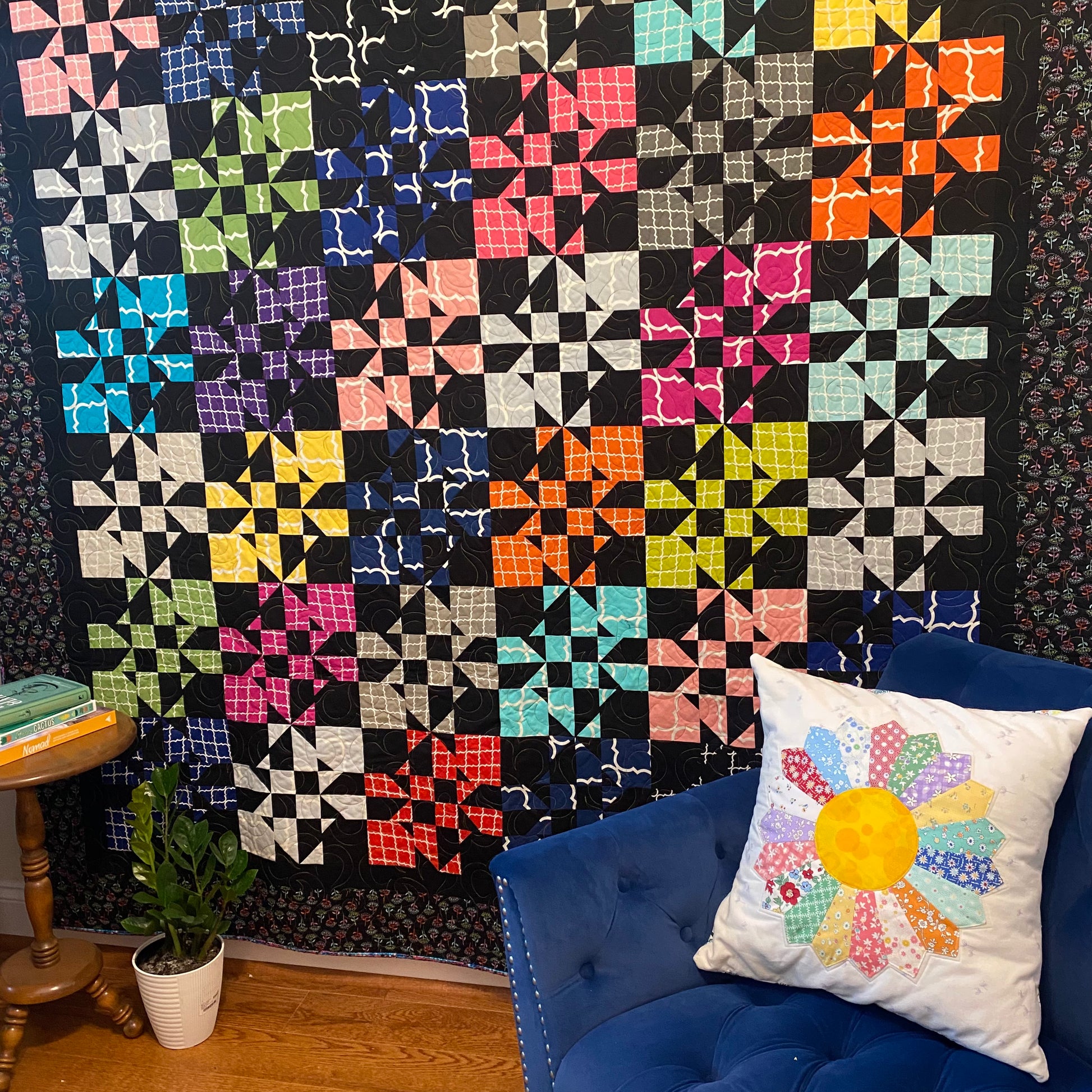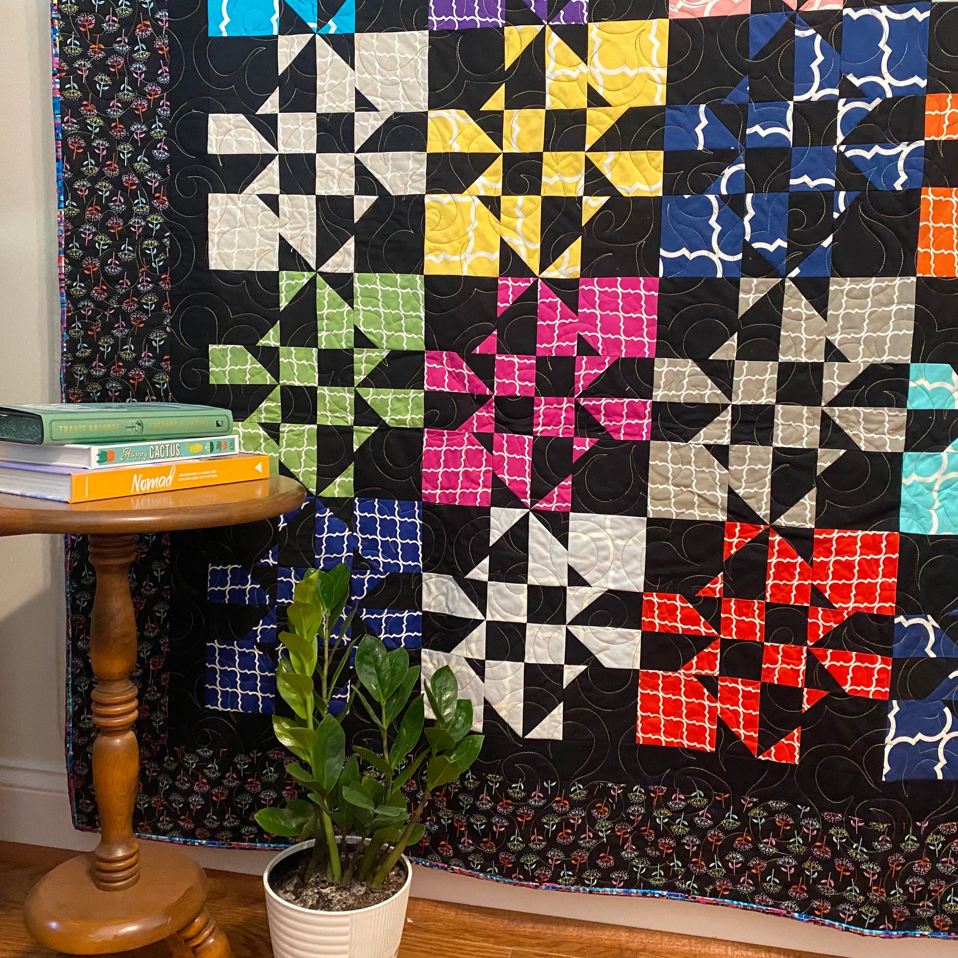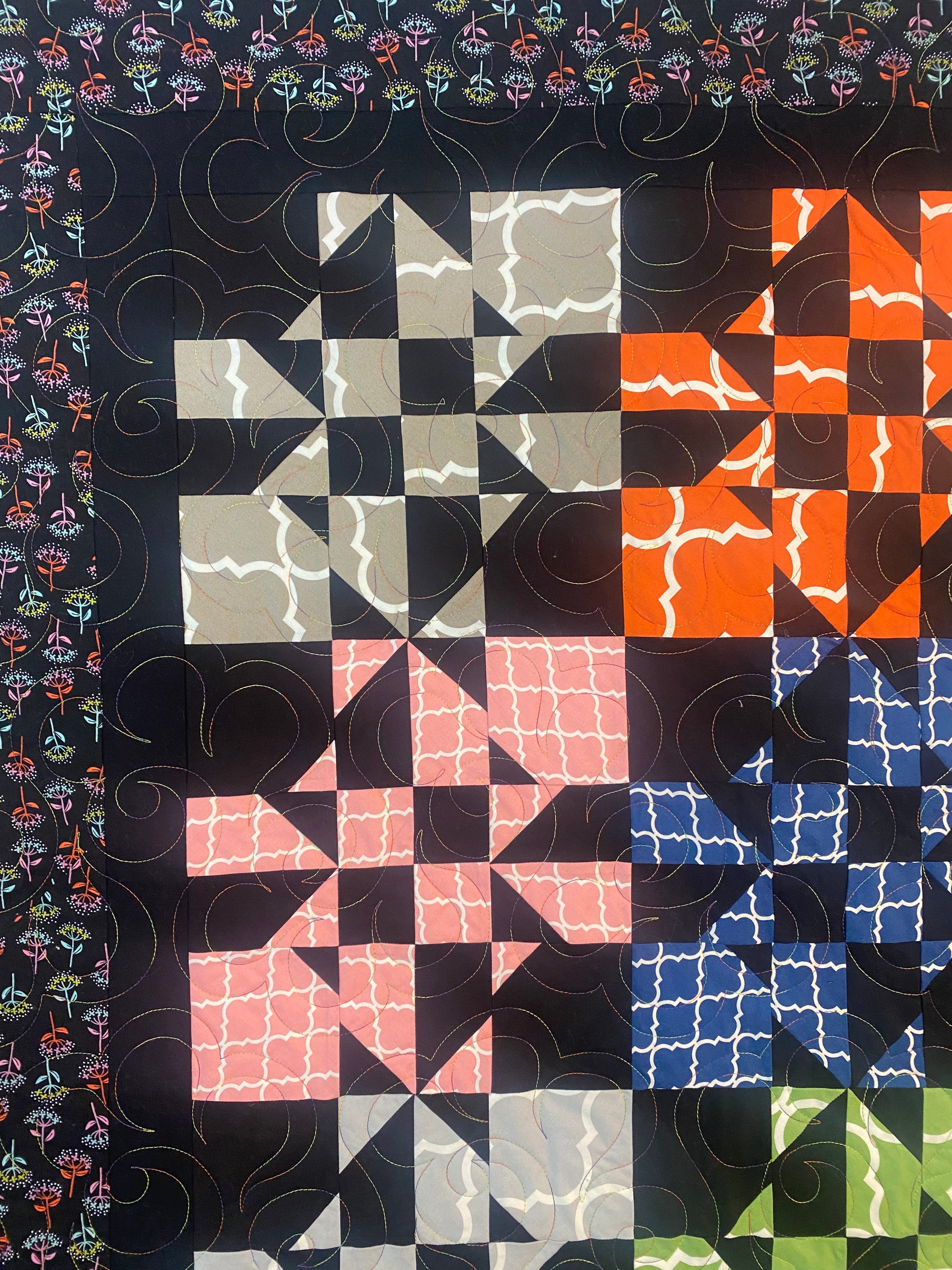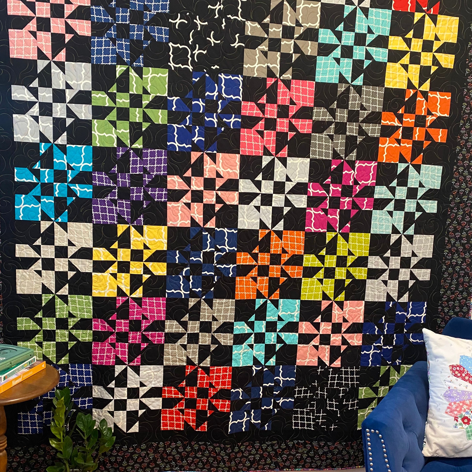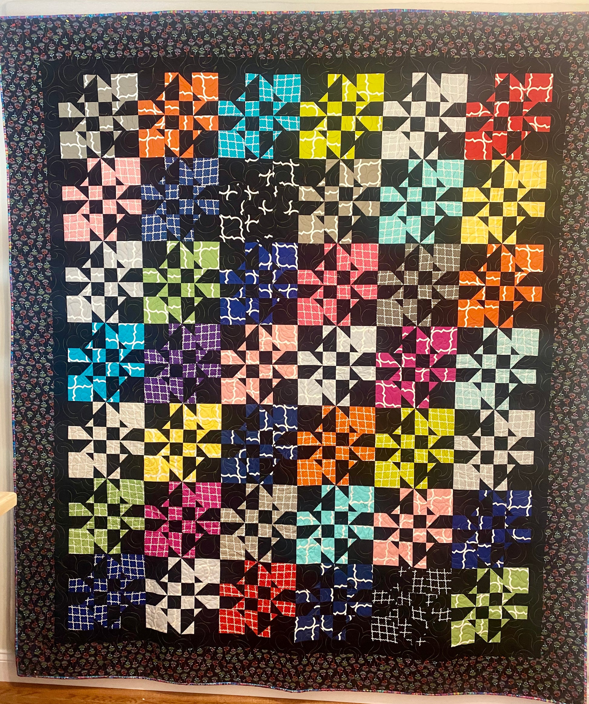 Infinity Braids is bold and a bit unusual! This quilt is made from a textured layer cake in rainbow colors and black. It's bordered in a 6 inches of complimentary small flowers, also on a black background. This spin on the crazy eight method would be a wonderful addition to any bedroom.