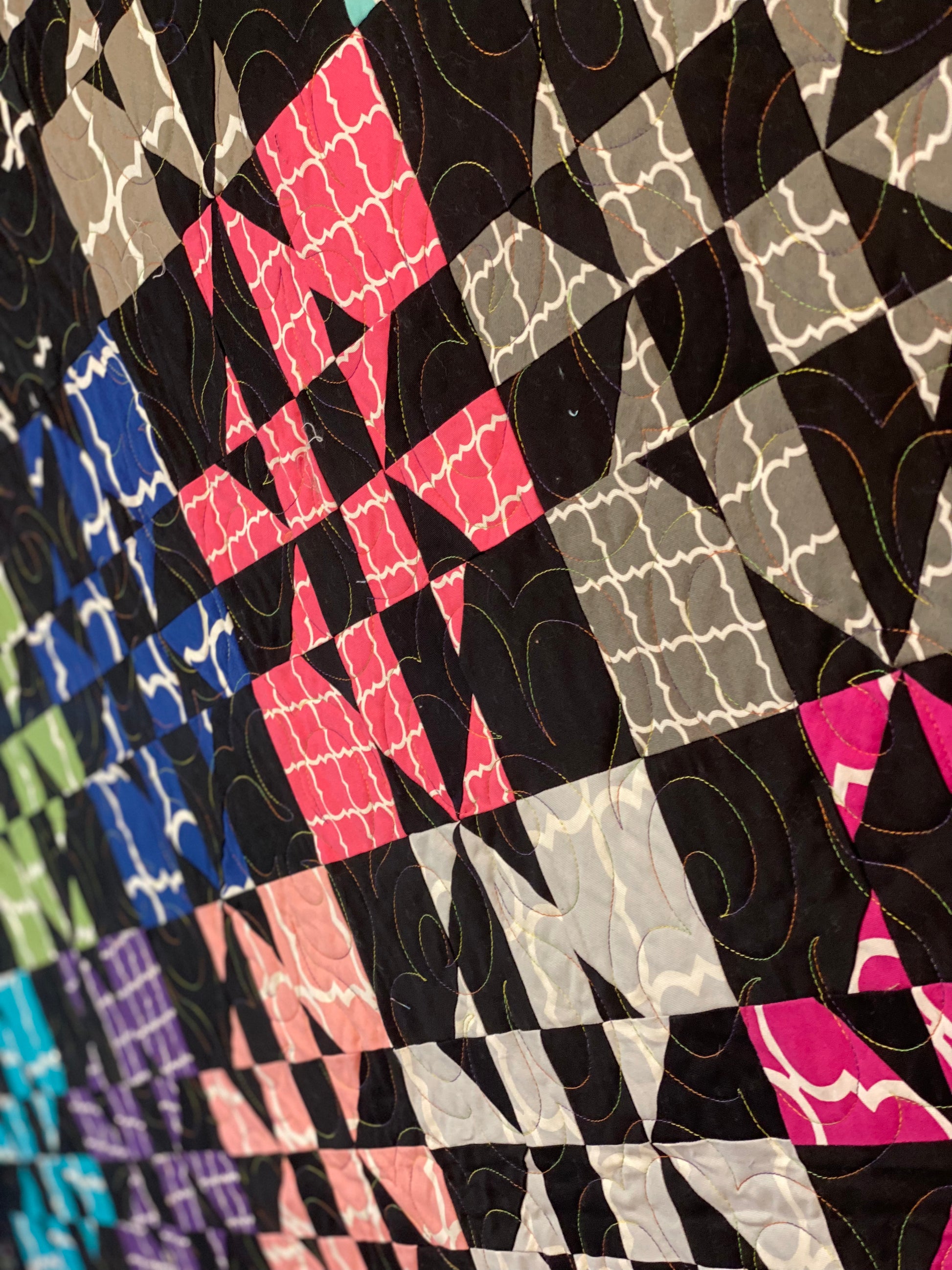 This quilt is backed in a large swath frenzy of colors, which was also used for the hand binding. It's filled with 80/20 batting, making it warm but light. Infinity Braids has been quilted all over in etched curves, with variegated thread. Sewn on a hand guided long arm.