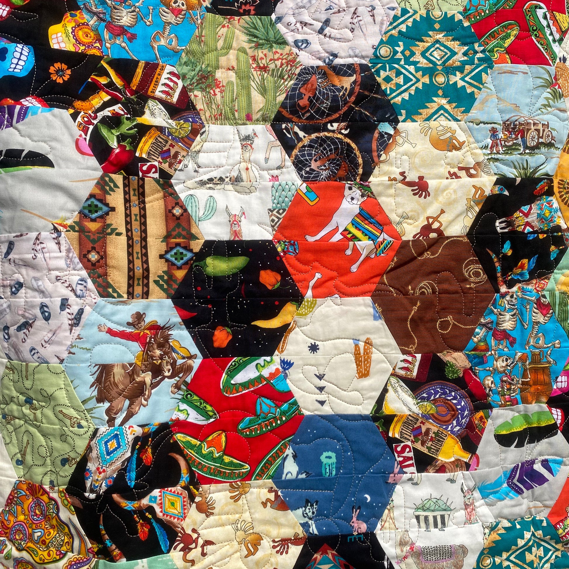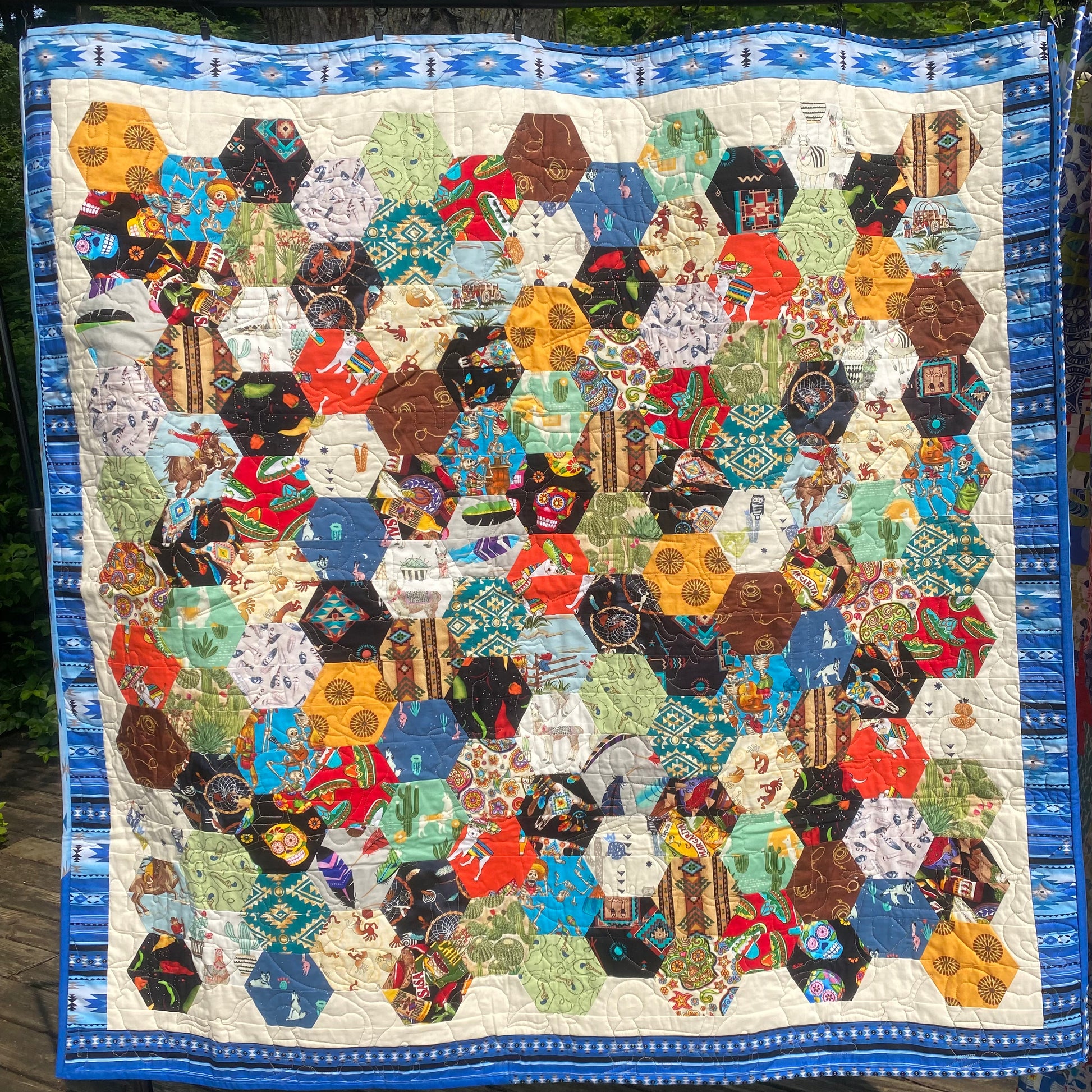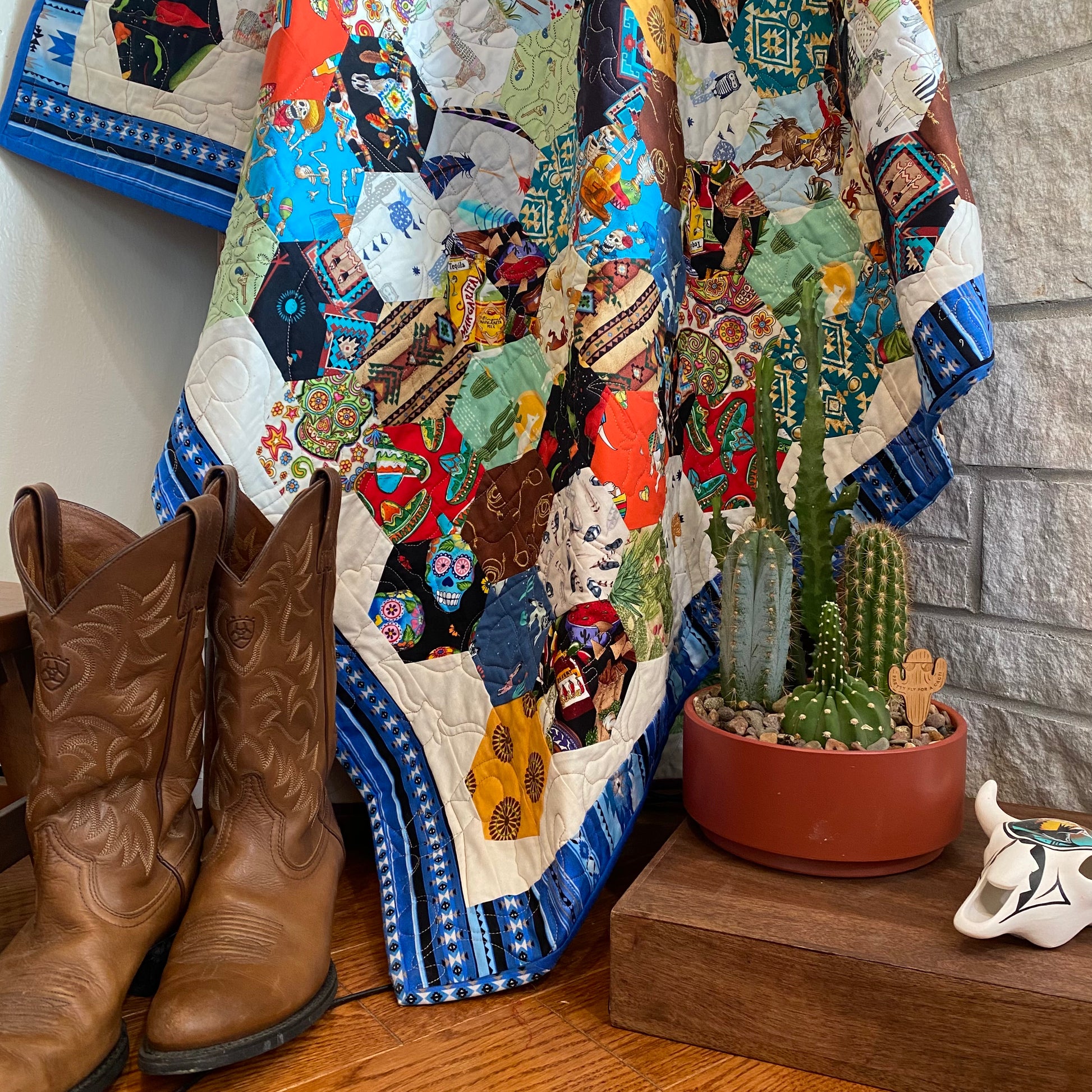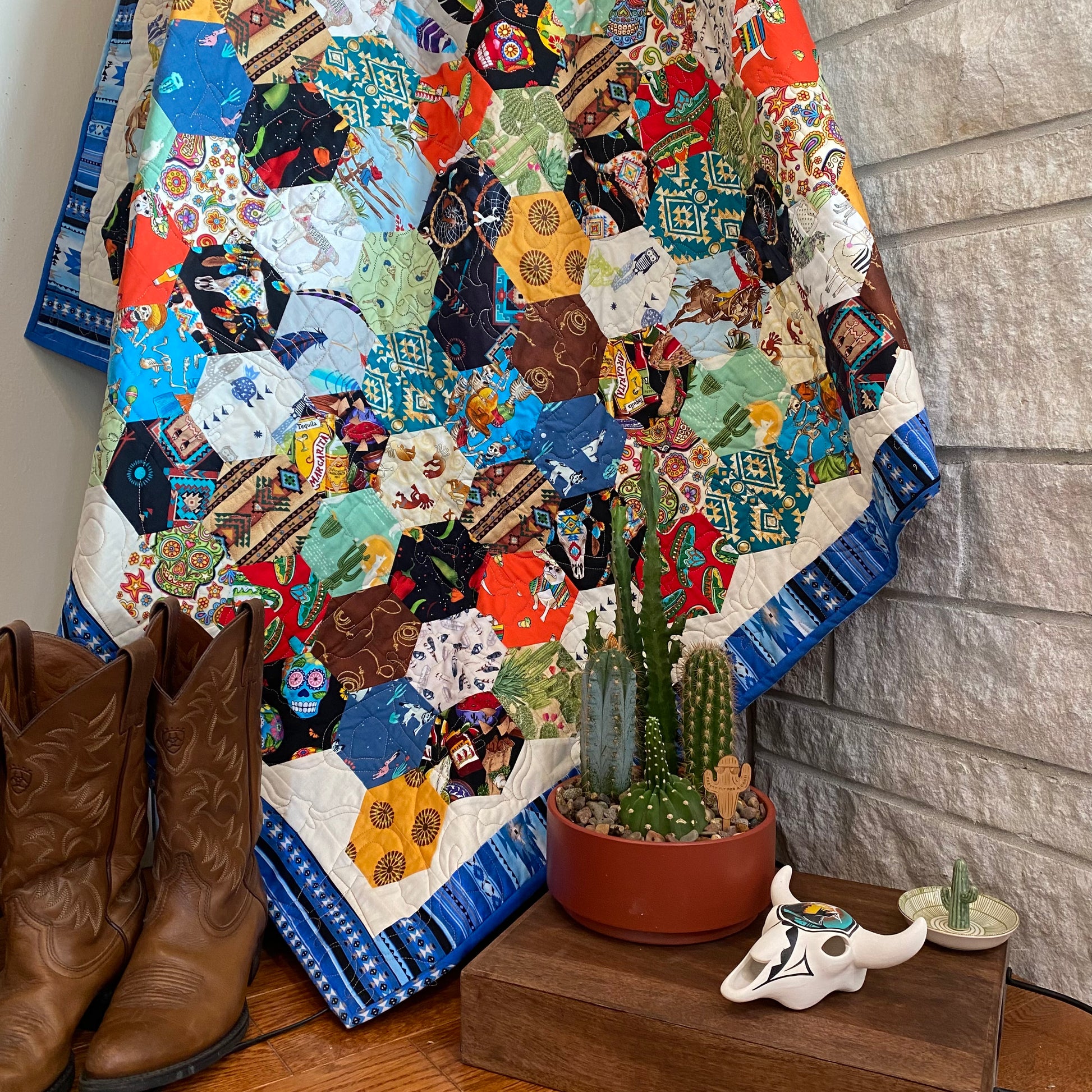 Me More Cowgirl quilt is inspired by the beautiful American Southwest! Featuring cactus, chilis, sombreros, feathers, skulls, Kokopelli, cowboys and lots of native animals. These colorful hexagon blocks are set into a cream background, and framed in desert style pattern in shades of blue. This quilt would be wonderful for your next road trip, staying warm on the porch, or an evening by the camp fire. It would make an engaging wall hanging, or a delightful finish to a themed room.