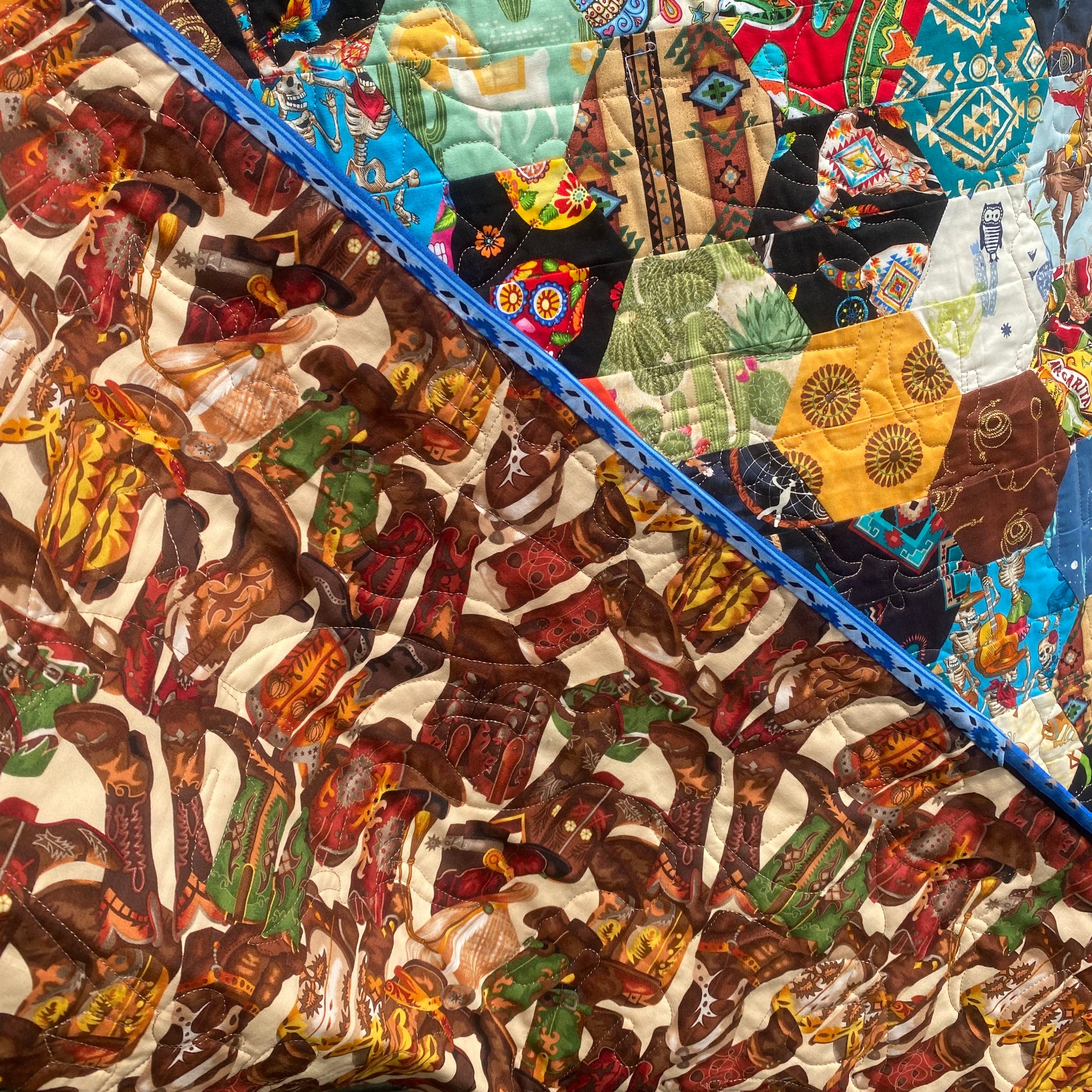 Me More Cowgirl is backed in cowboy boots fabric, with a variety of designs. It was hand guided on a machine long arm, and stitched with longhorns, cactus and cowboy hats. This quilt is filled with 80/20 batting, and hand bound in blue.
