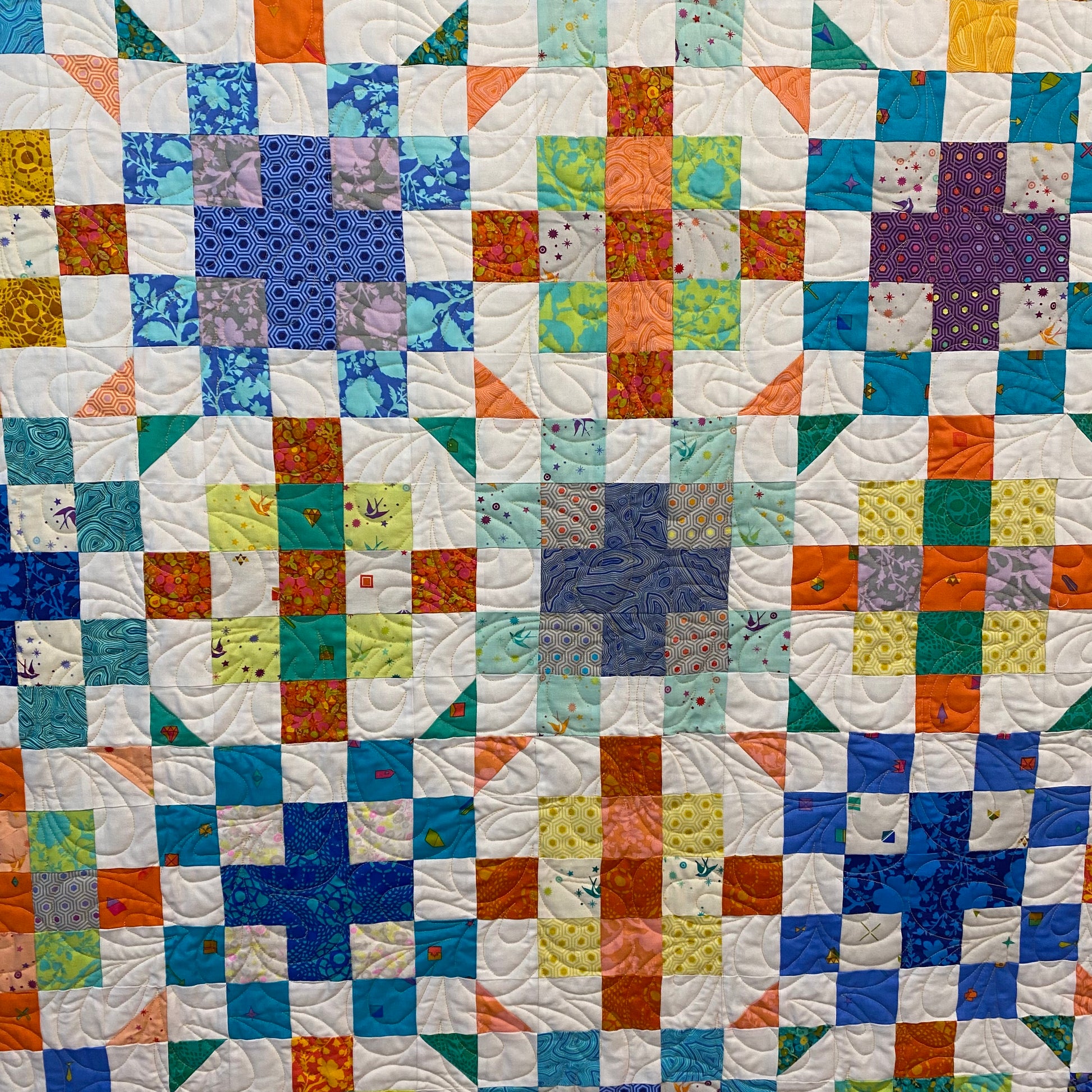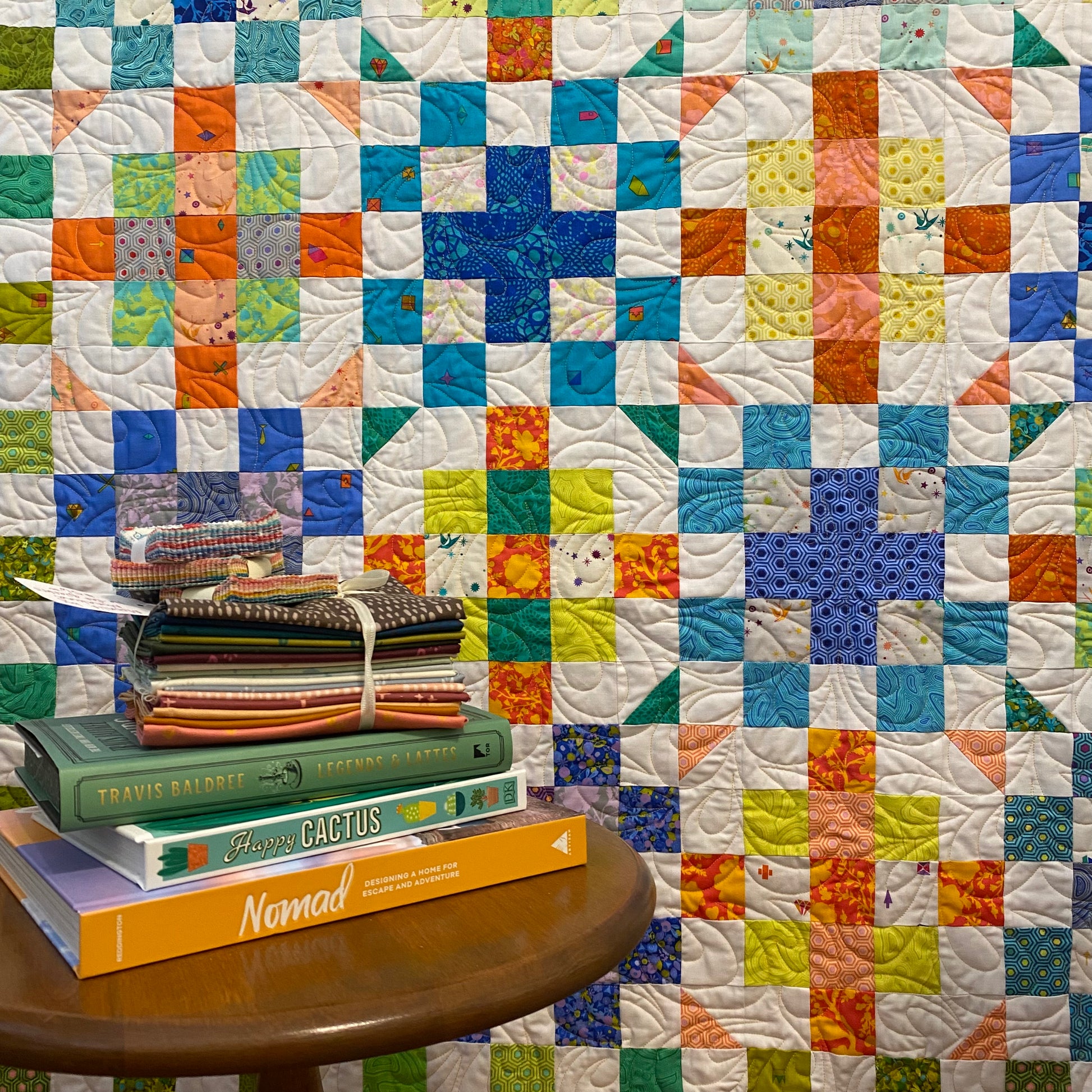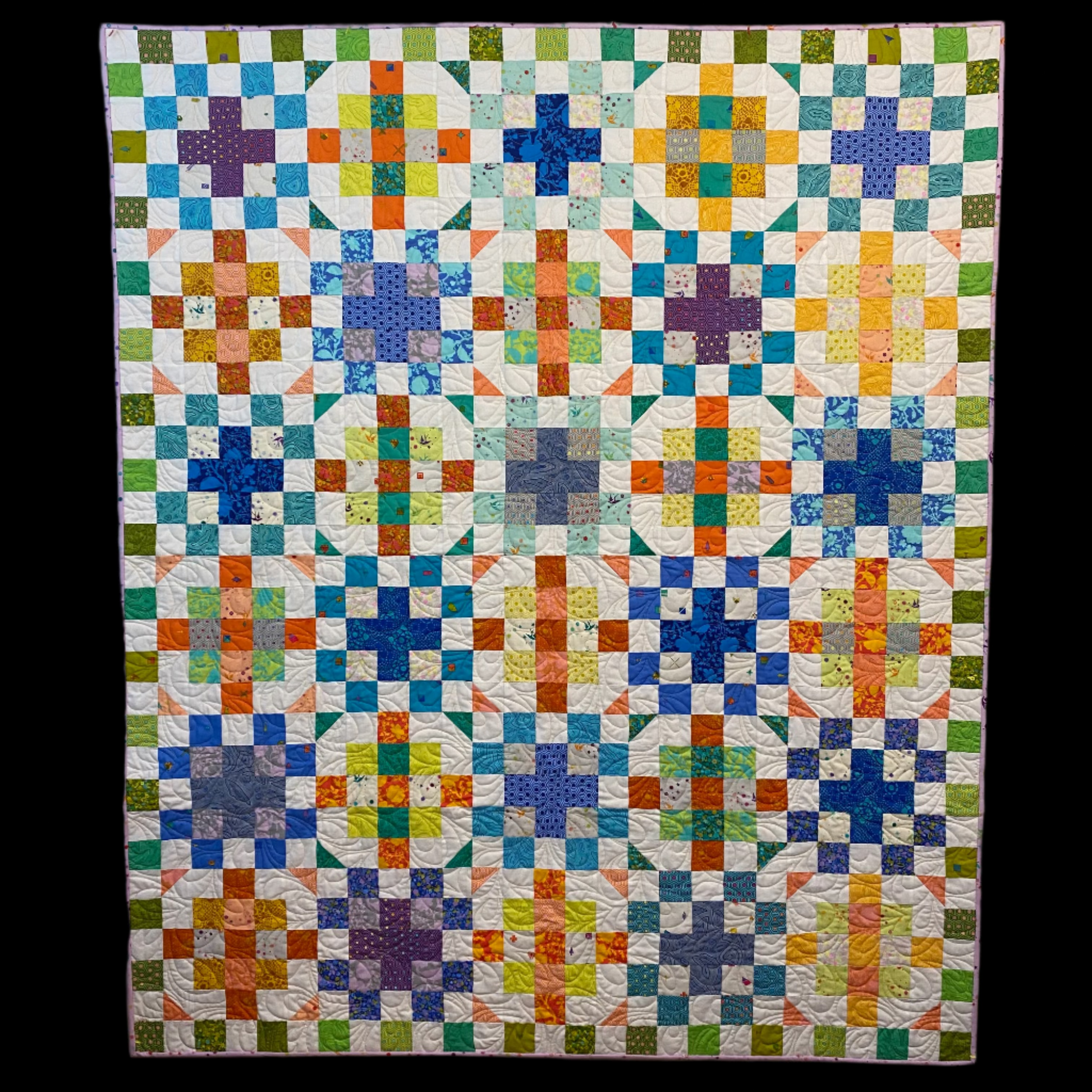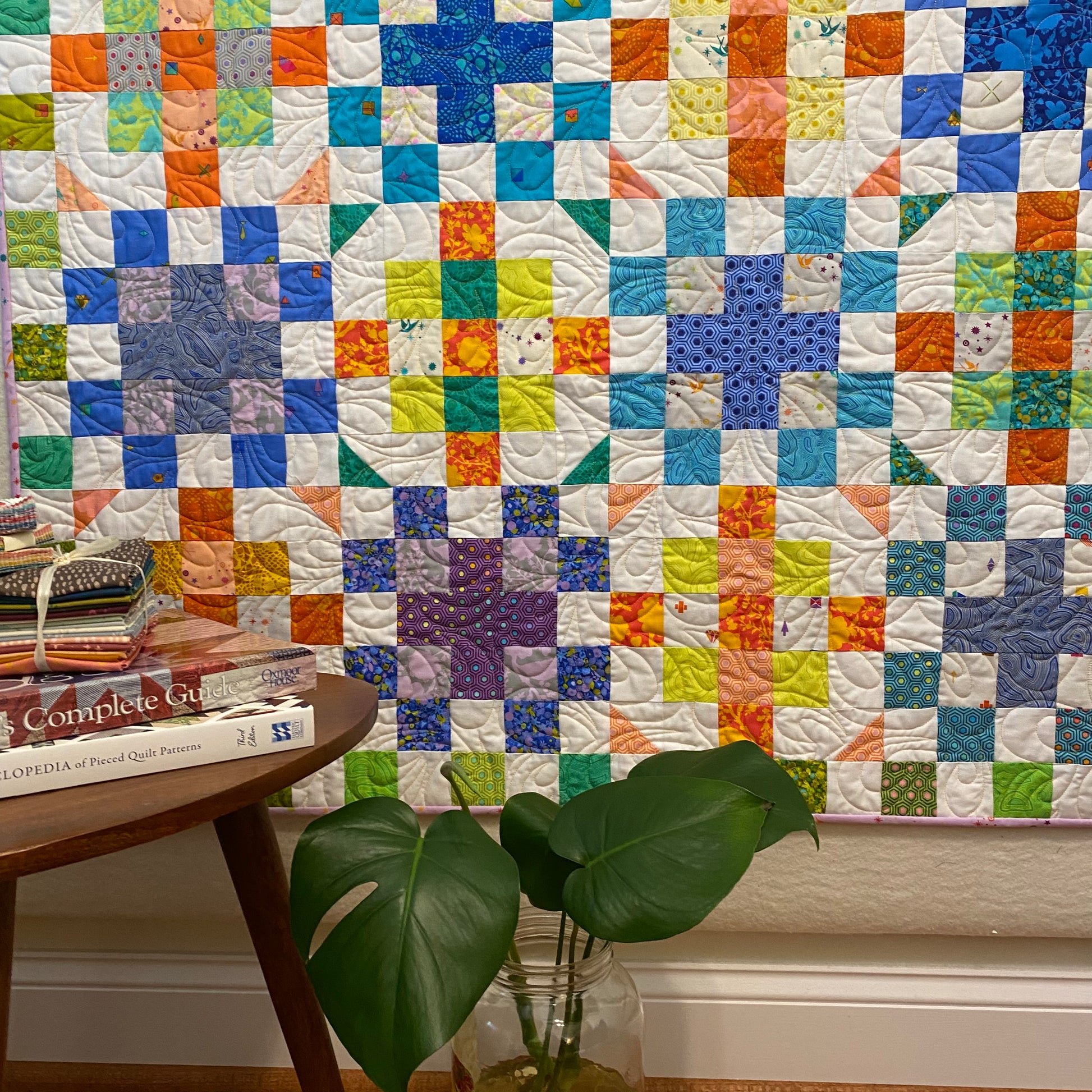 Traditional piecing meets modern design in this bright quilt! Neon Hopscotch brings together classic blocks with modern fabrics. Geode spirals, stars, sparrows, hexagons, flowers, triangles, and hearts create a playful vibe among the variety of prints. A delightful assortment of blues, greens, yellows, oranges, and reds blend together in varying shades.