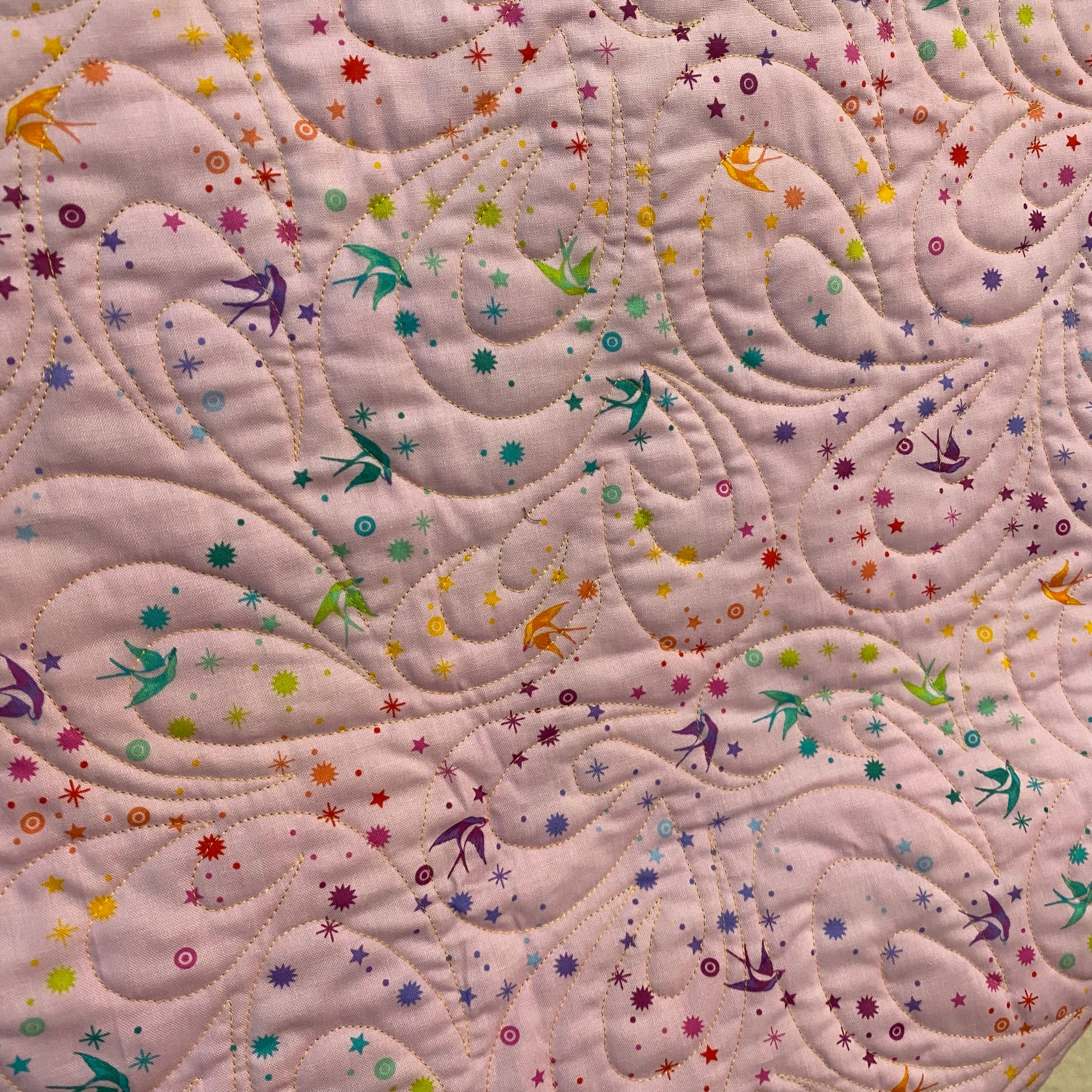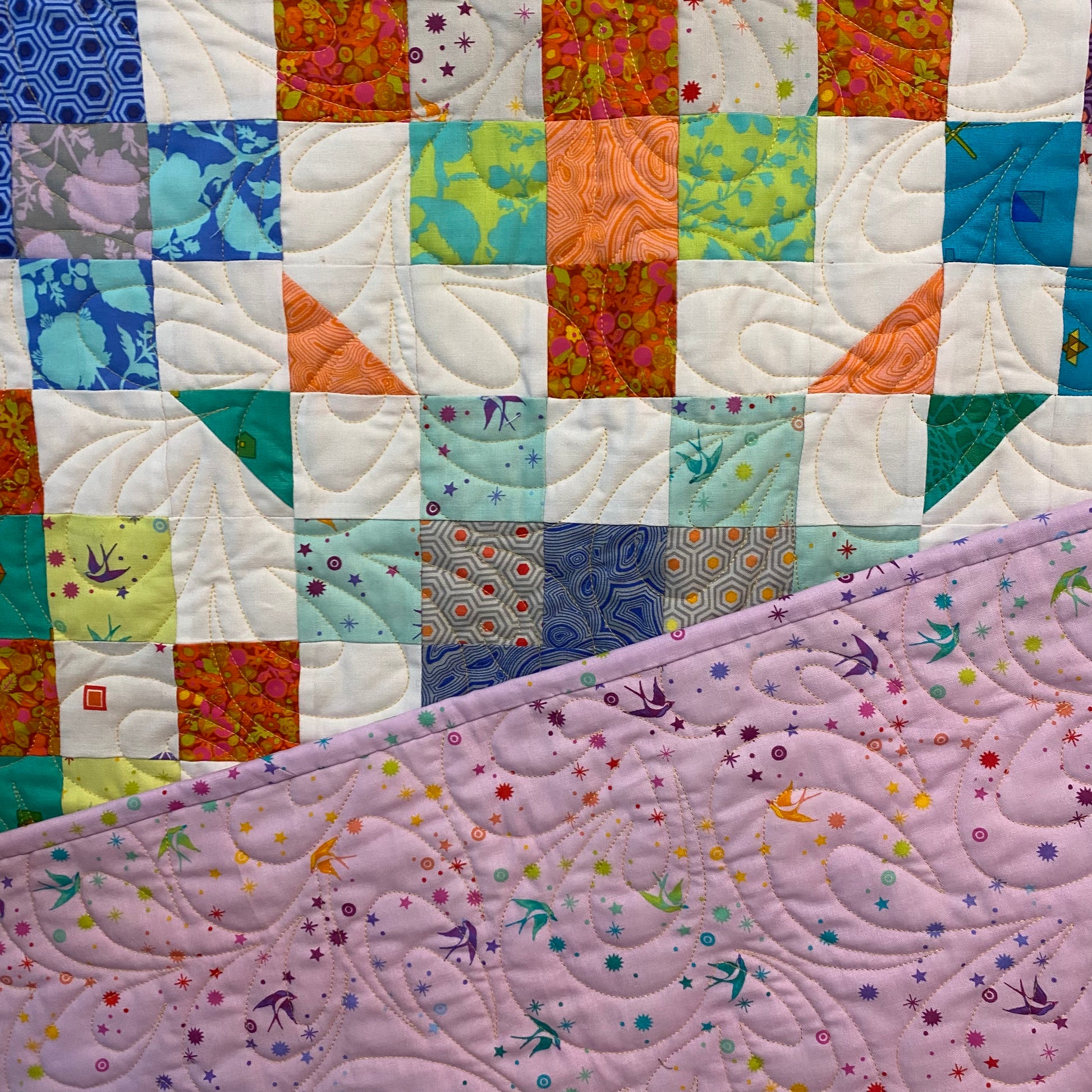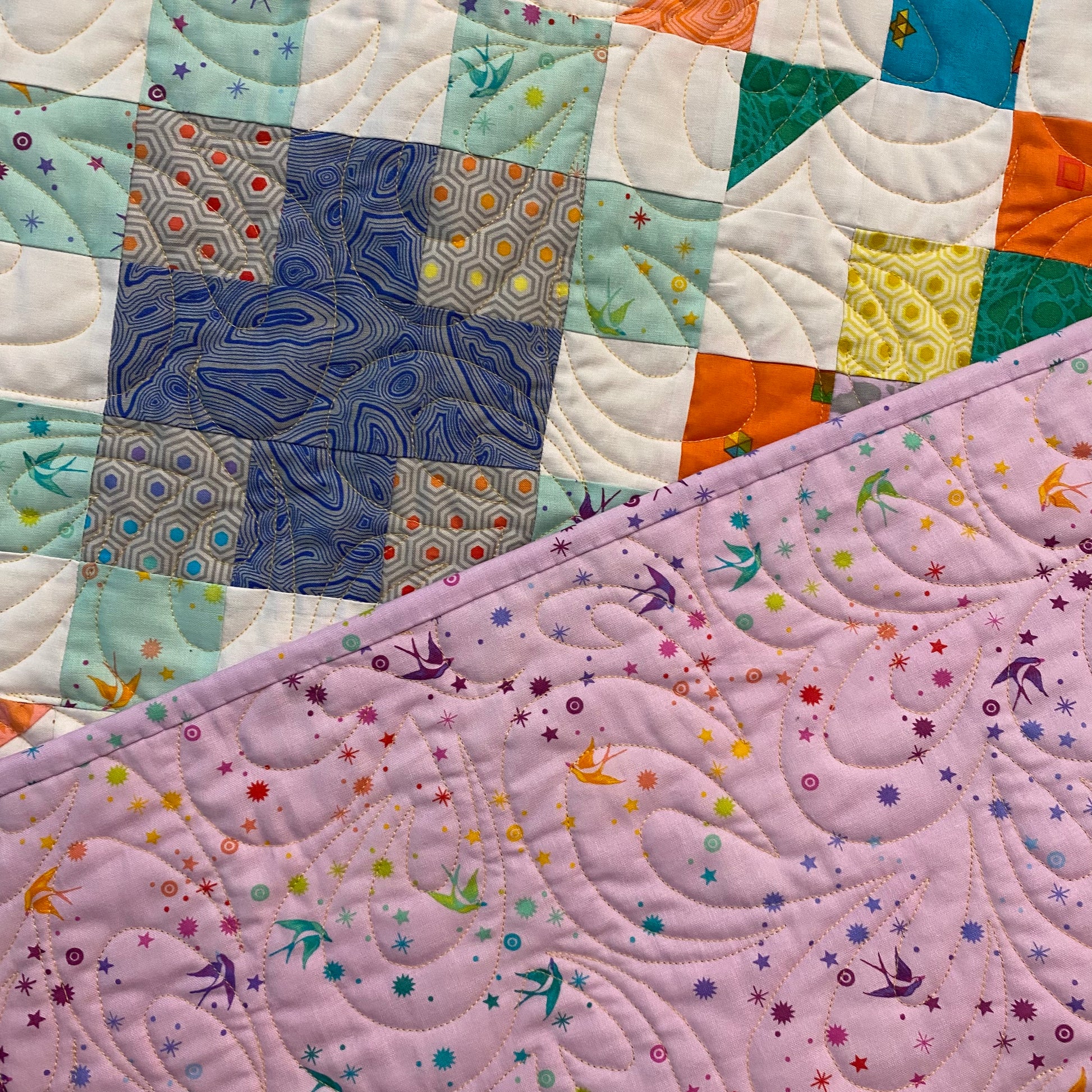 Neon hopscotch is backing with coordinating light purple cotton fabric, and features more stars and sparrows. Edge to edge quilted on a hand guided longarm with golden yellow thread. Hand bound in purple blinding. This sweet throw quilt is perfect for snuggling under or taking on the road for long trips.