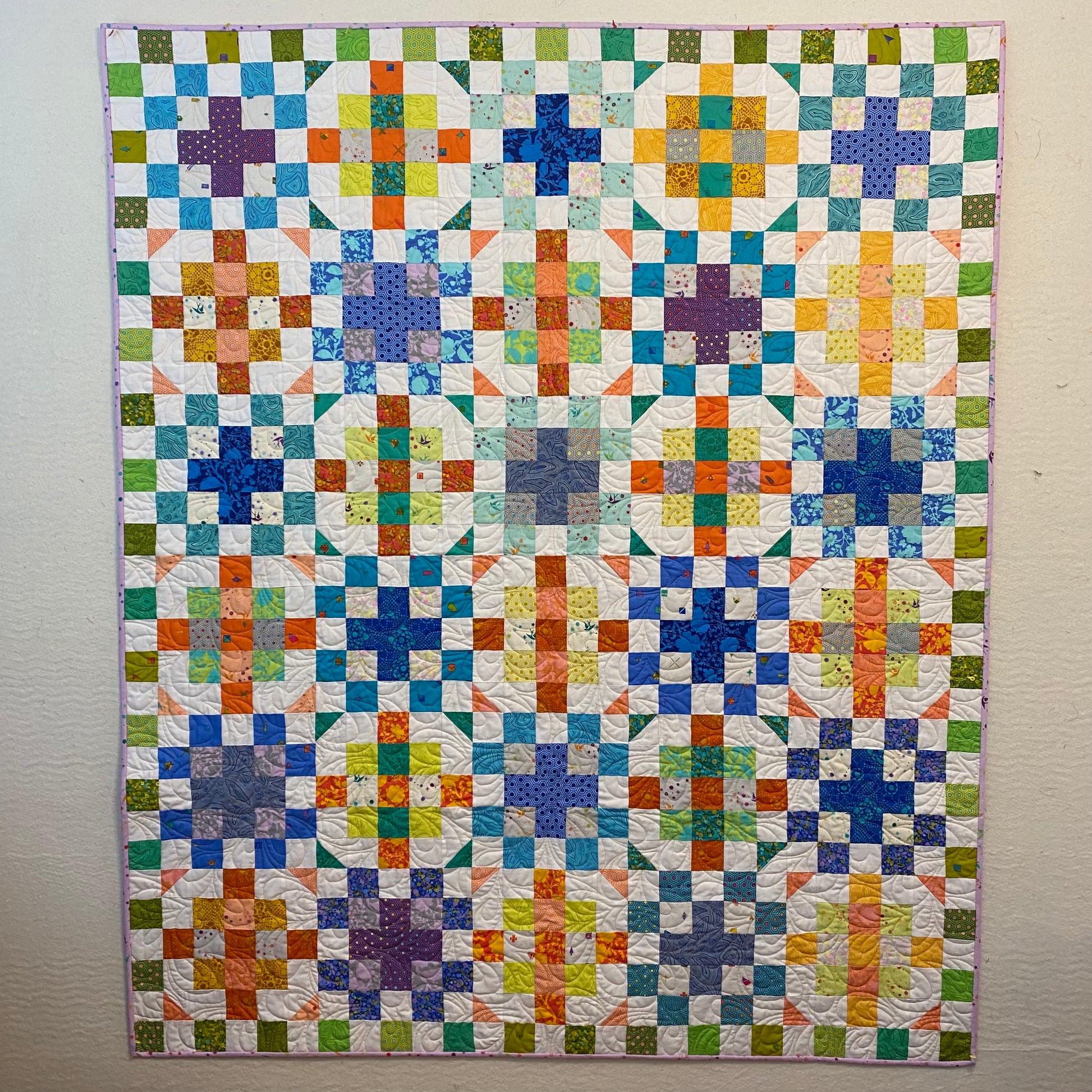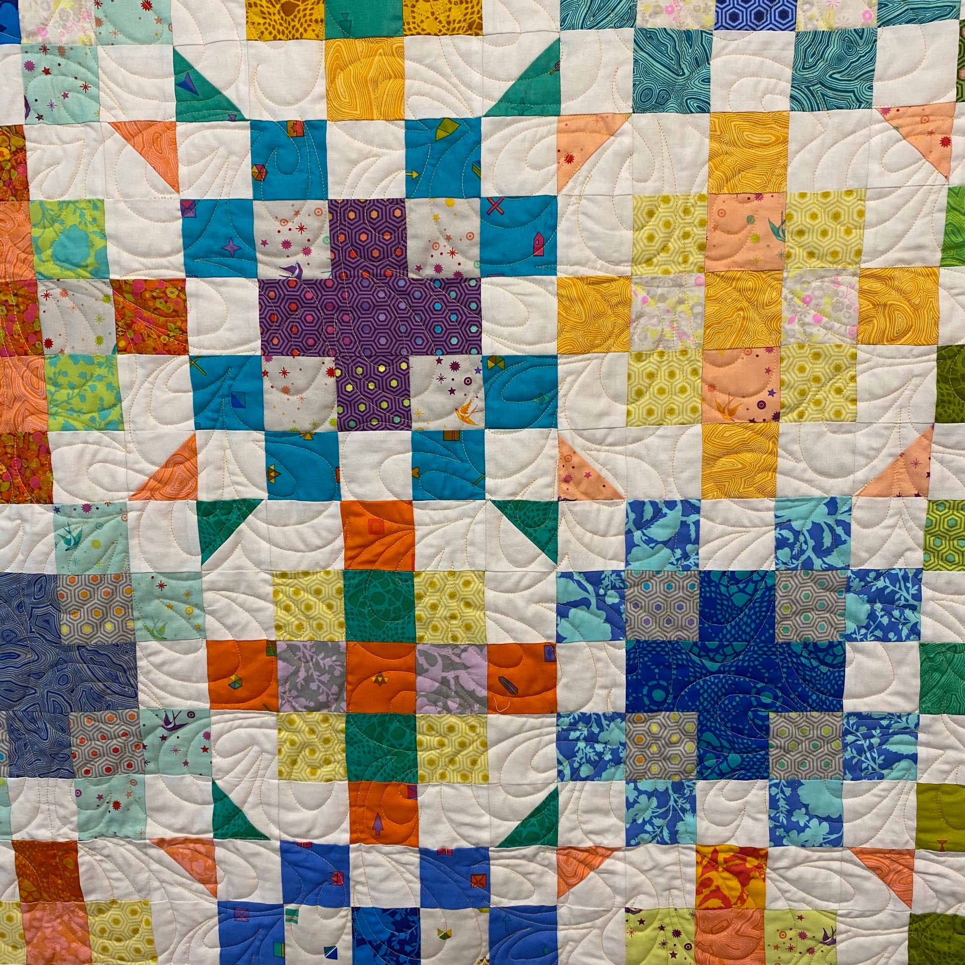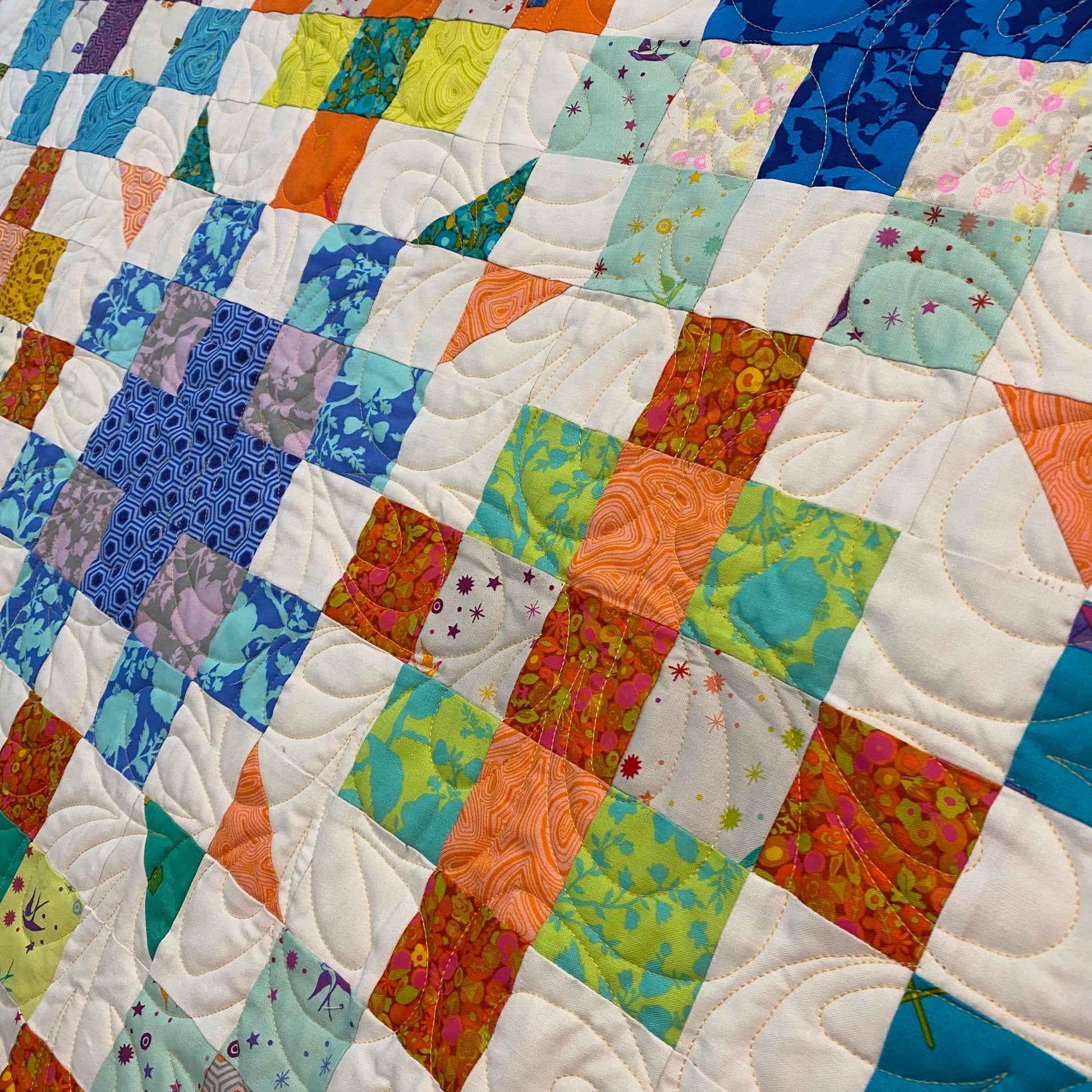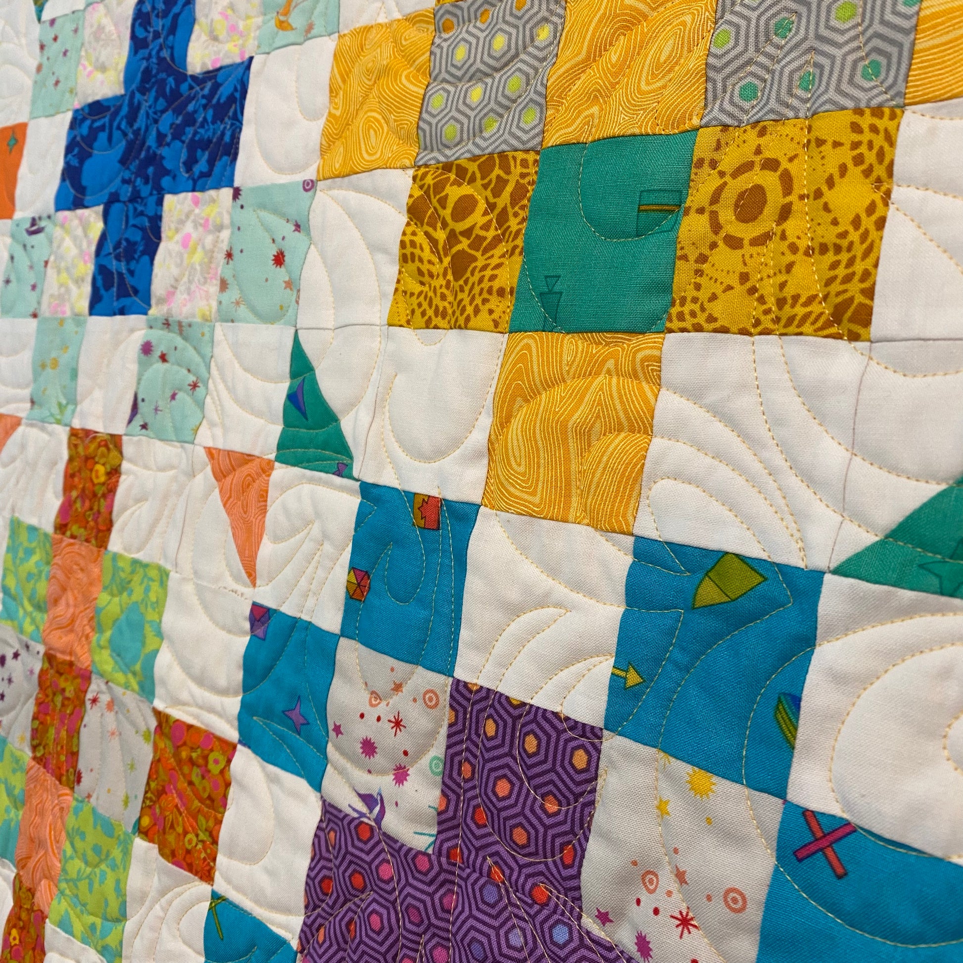 Neon hopscotch is backing with coordinating light purple cotton fabric, and features more stars and sparrows. Edge to edge quilted on a hand guided longarm with golden yellow thread. Hand bound in purple blinding. This sweet throw quilt is perfect for snuggling under or taking on the road for long trips.